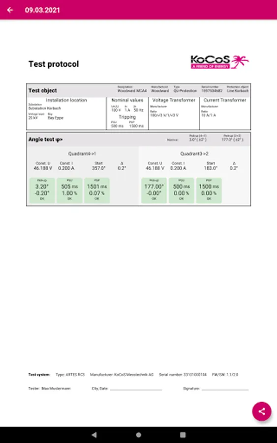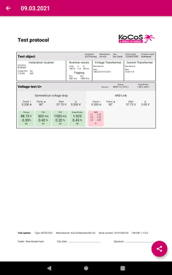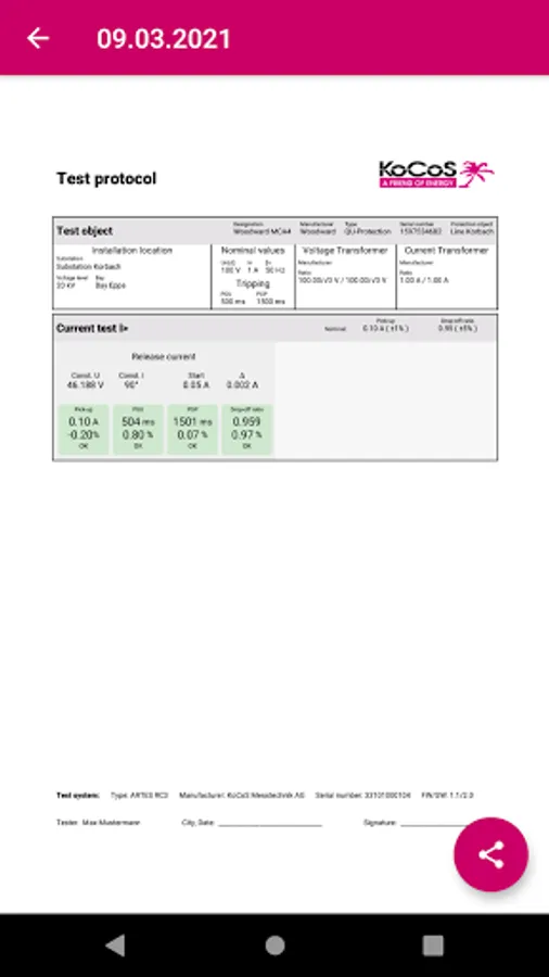 The transmitted results are processed by the app and can then be linked with test object data and summarized in a PDF test report.