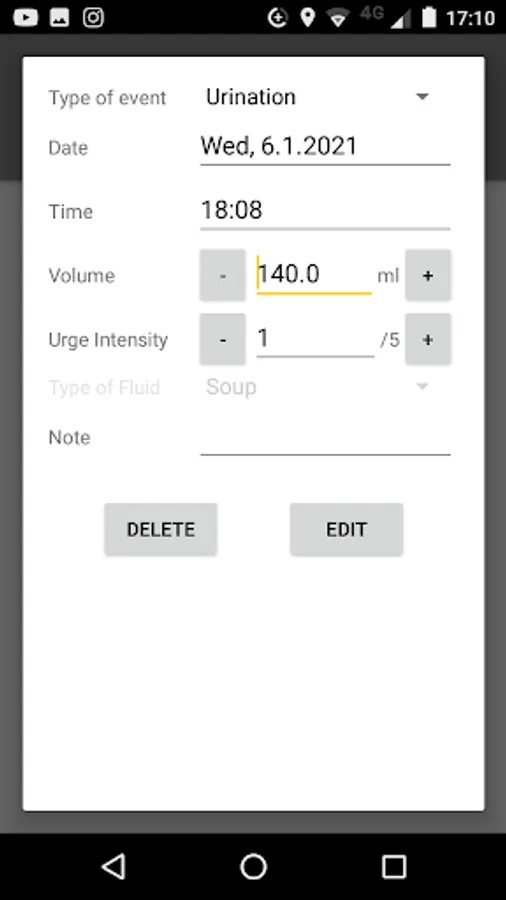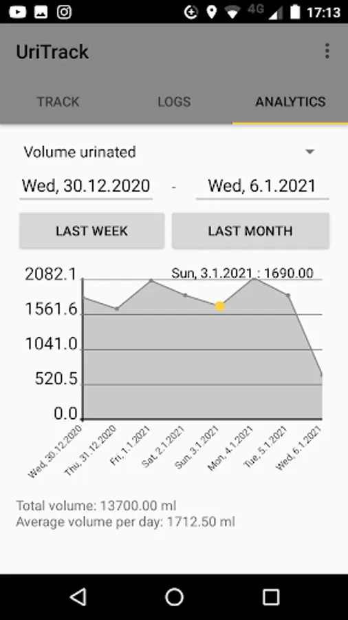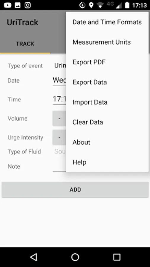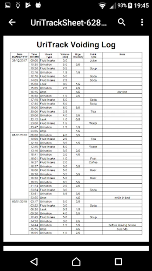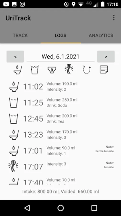 UriTrack is an app which enables you to log your urinary events (urination, leaks, urges, cathether use) as well as your fluid intake and notes. This is a replacement for a voiding log or a voiding diary that is often used in diagnostics of various urinary problems.