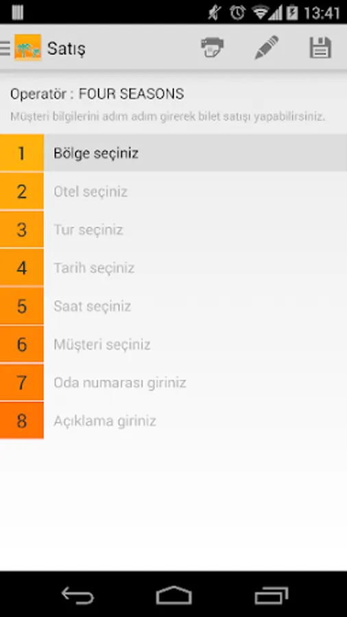 In the Sedna Mobile TourSale module, you can select the region, select the hotels in the region, see the customer list, and select the customer who wants to join the tour and sell to the desired tour. During this sale, hotel pick-up times are registered in the system either by the guide or according to the previously defined time. When the payment type is selected as credit card or cash, the collection record is made accordingly.
