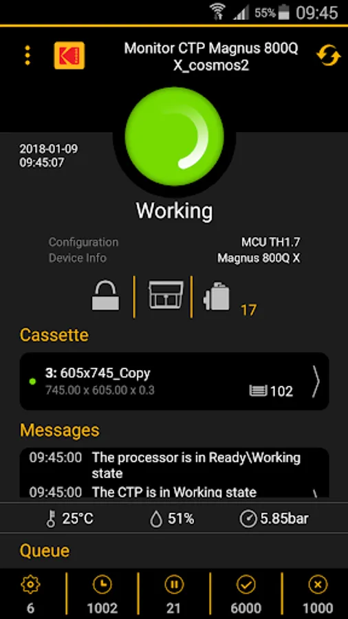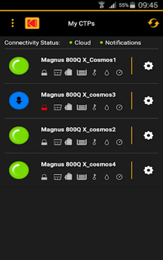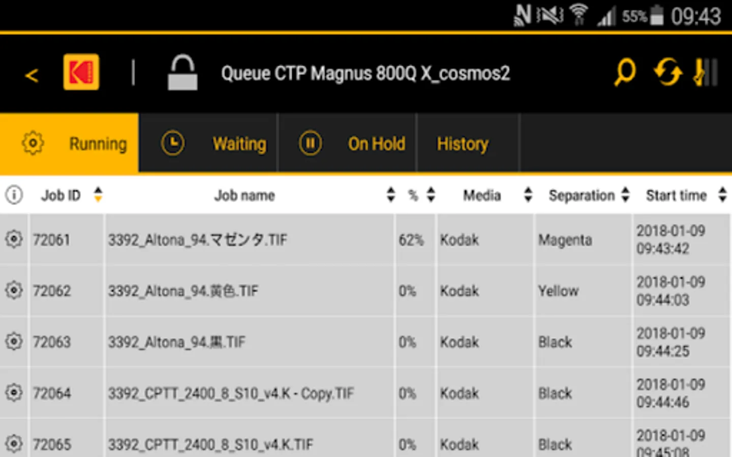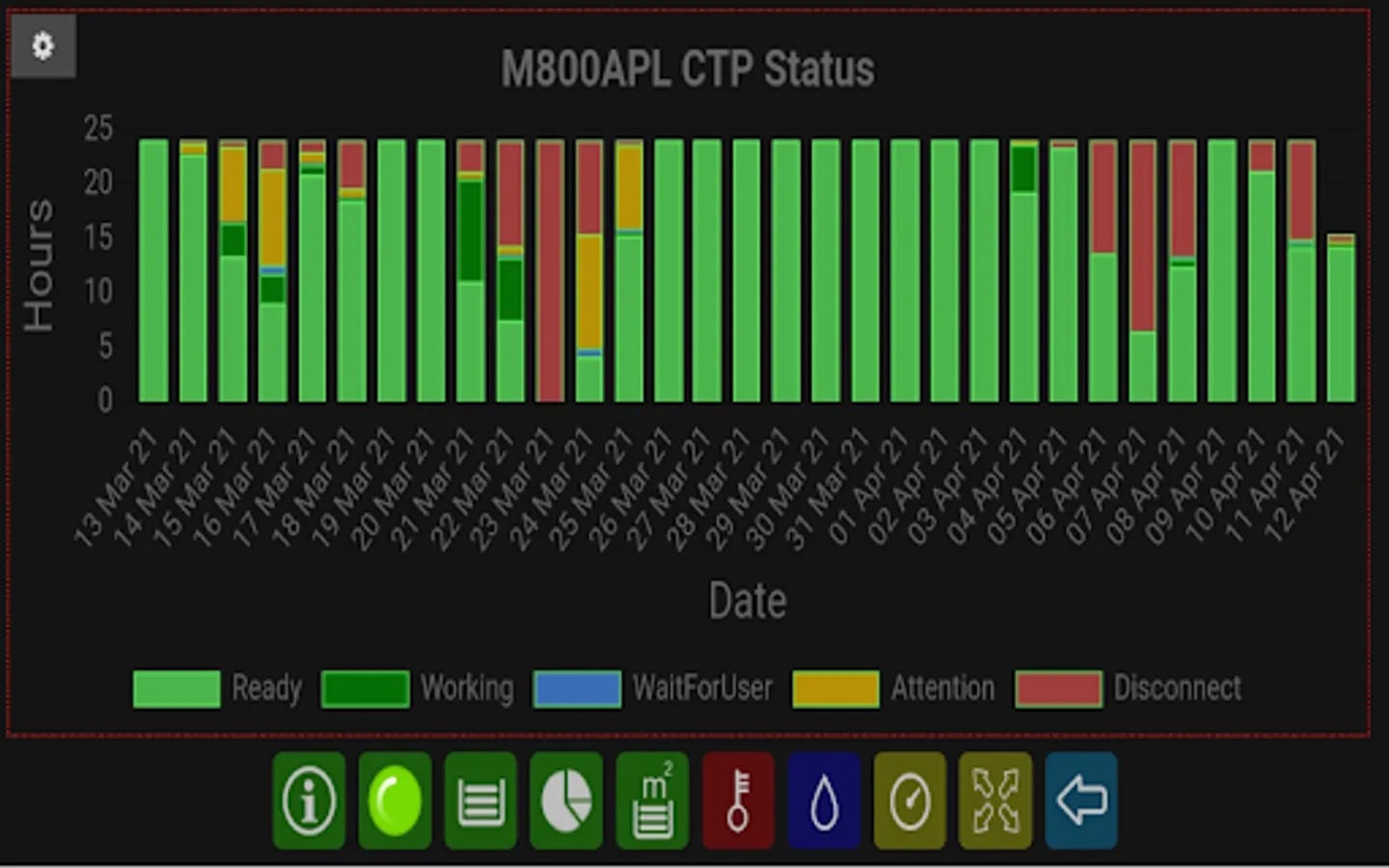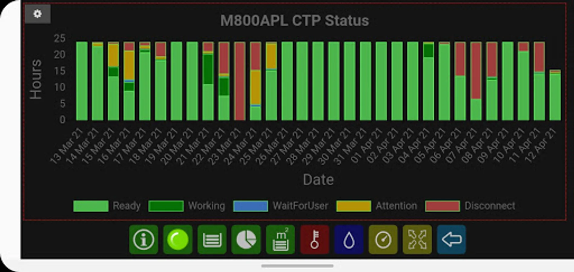 • App shows whether CTP device is running or stopped for any reason, plus detailed information such as current job, jobs in the queue, active plate cassette count, environmental conditions, event history, and more.