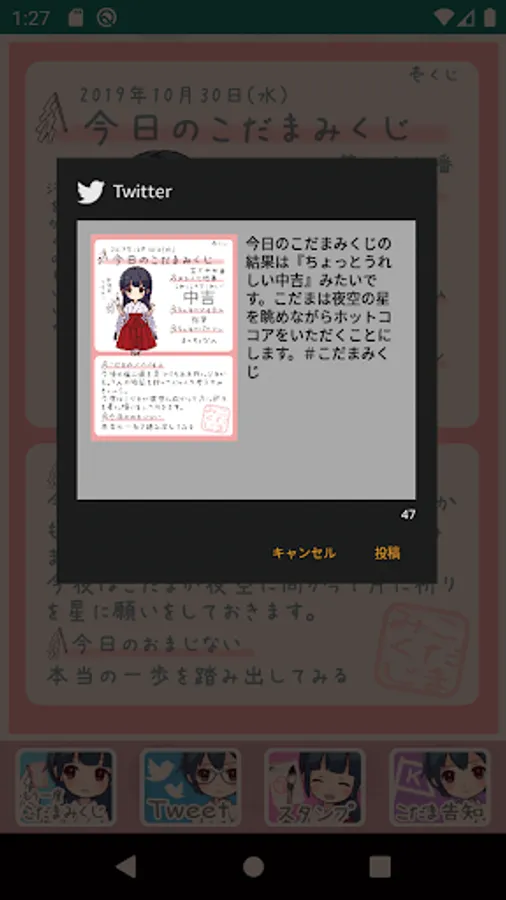 結果をtwitterでつぶやいて、今日のおみくじは終了です。