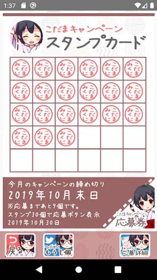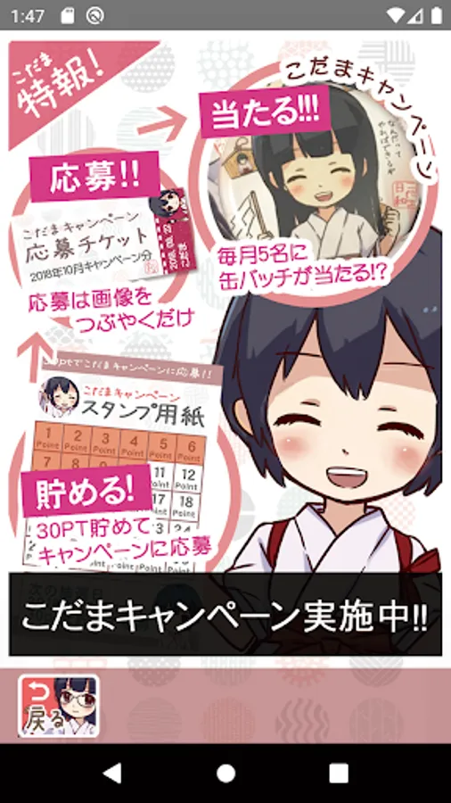 アプリ上でスタンプを貯めて、毎月5名に「こだま缶バッチ」が当たるキャンペーンに応募できます。