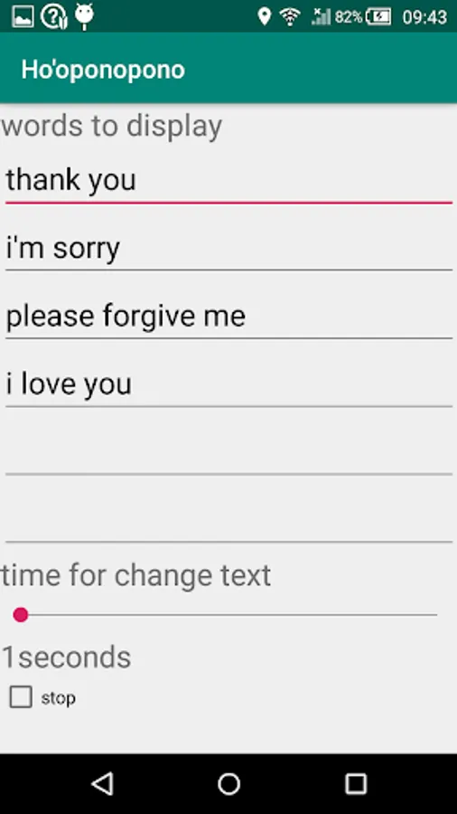 Press and hold the blank area of the screen, select the widget, press and hold the Ho'oponopono widget, and place it on the screen. When you tap the widget, you can set and change up to six words to display, and you can choose the time spacing between the switches.