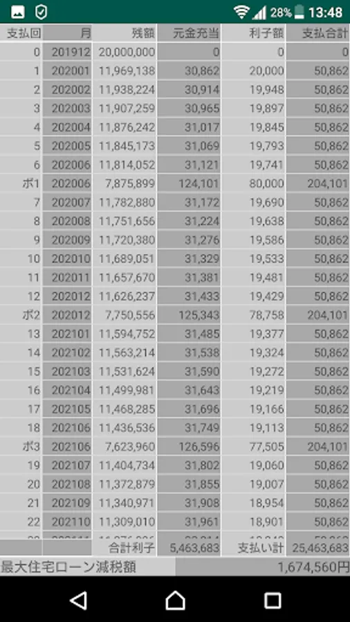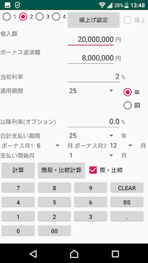 Enter the principal and bonus payment amount (optional), the first interest rate, the first interest rate period, the second interest rate (optional), the total payment period, and set the bonus month. When you press the calculation button, the payment schedule will be displayed.