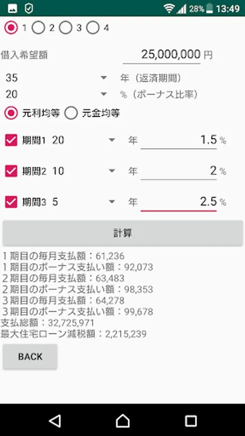 Set the principal and bonus repayment ratio, the number of years of the period, and the interest rate of each period, and select whether the principal is equal or the principal equal.