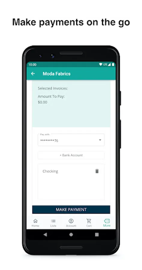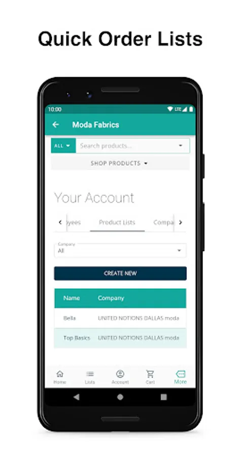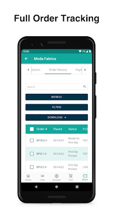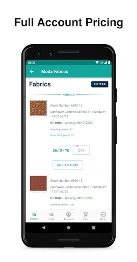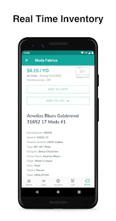 The Moda Fabrics app features include full access to your online account and account pricing, as well as real time inventory and full order tracking along with payments.