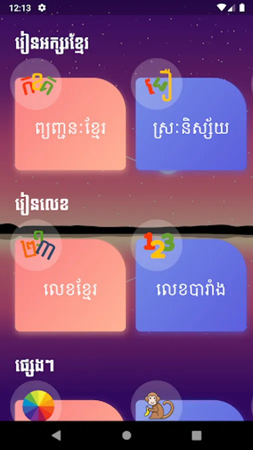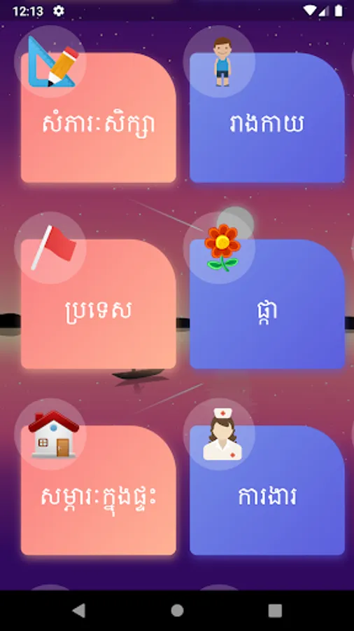 This app teaches you about Khmer/English consonants, vowels, vegetables, jobs, and many other categories.