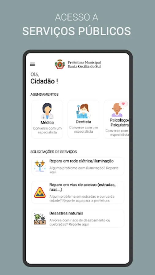 The Santa Cecília do Sul application offers citizens the possibility of scheduling appointments in the health area and requesting services and improvements in a very simple and practical way, all through the cell phone;