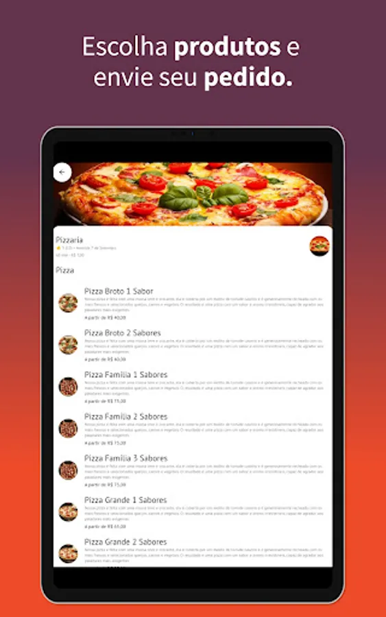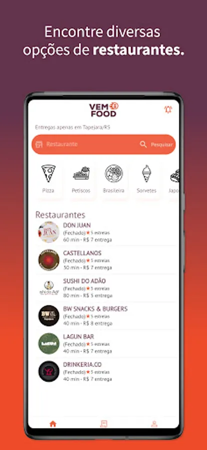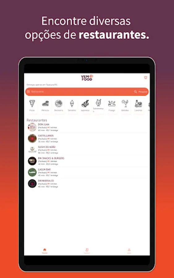 With the Vem Food app, you have access to complete menus of the most diverse restaurants, from fast foods to more sophisticated restaurants. You can choose from different types of food, such as Japanese, Italian, Brazilian, Mexican, among others.