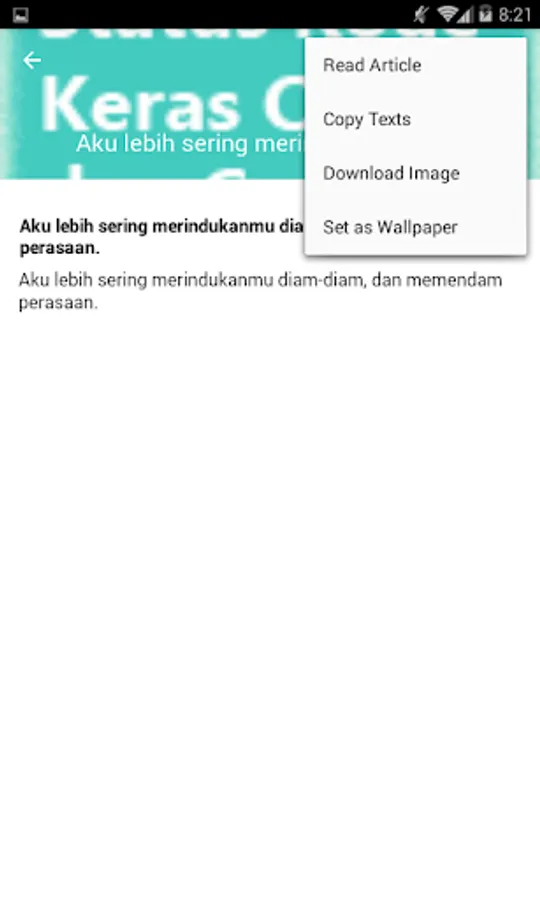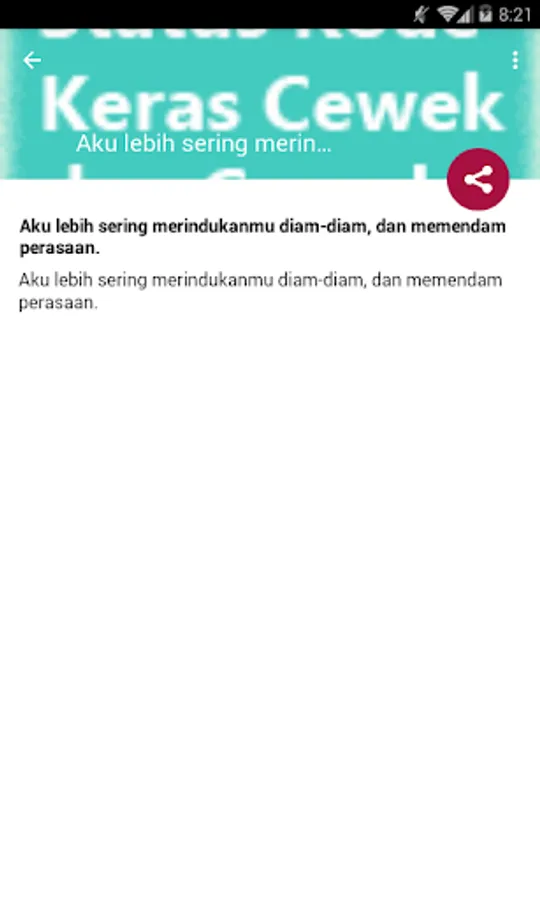 This collection of statuses we collect from various sources that you can share to social media on Facebook, BBM, WhatsApp, Instagram, etc. or you can also tweet to your Twitter, immediately download the application for free.