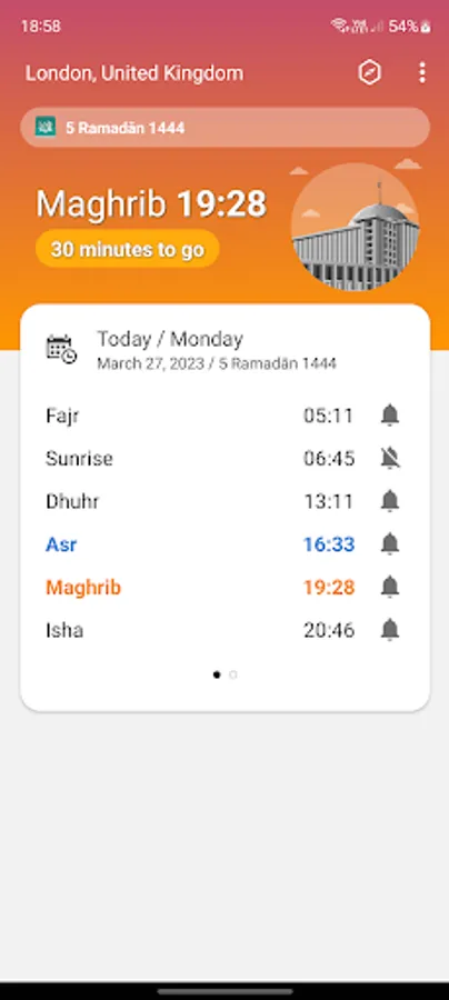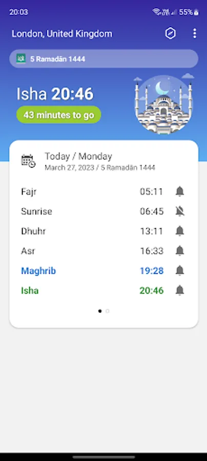 1. Prayer schedule calculation using selected calculation method. The app will try detect the best method for you, but you can always change it later. We support among others:
