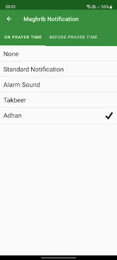 2. Various pray notification choices. You can use Azaan (call to prayer) alarm or just use standard notification to be reminded of prayer time.