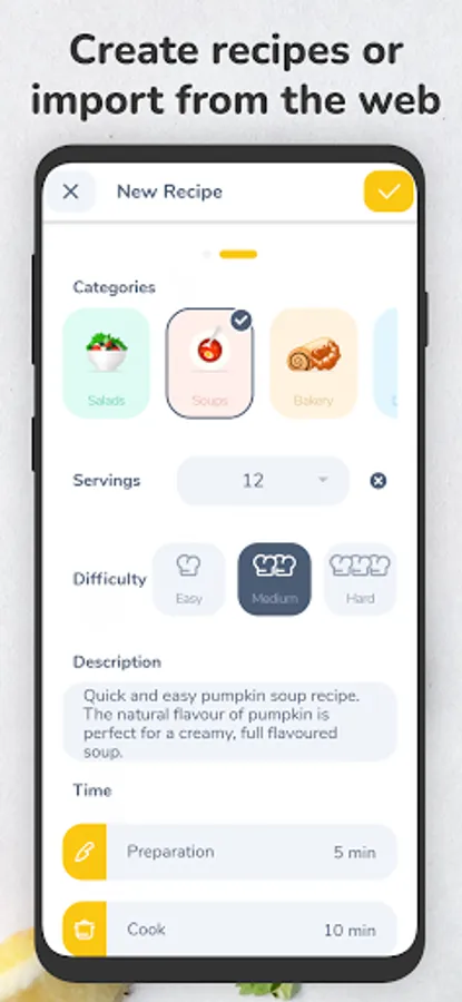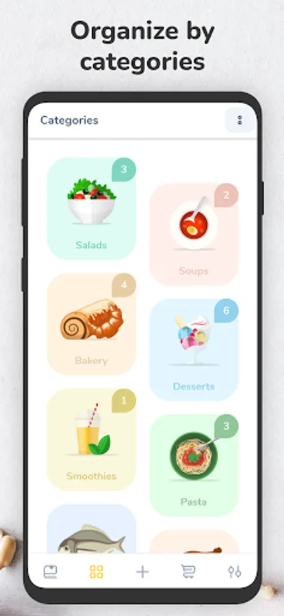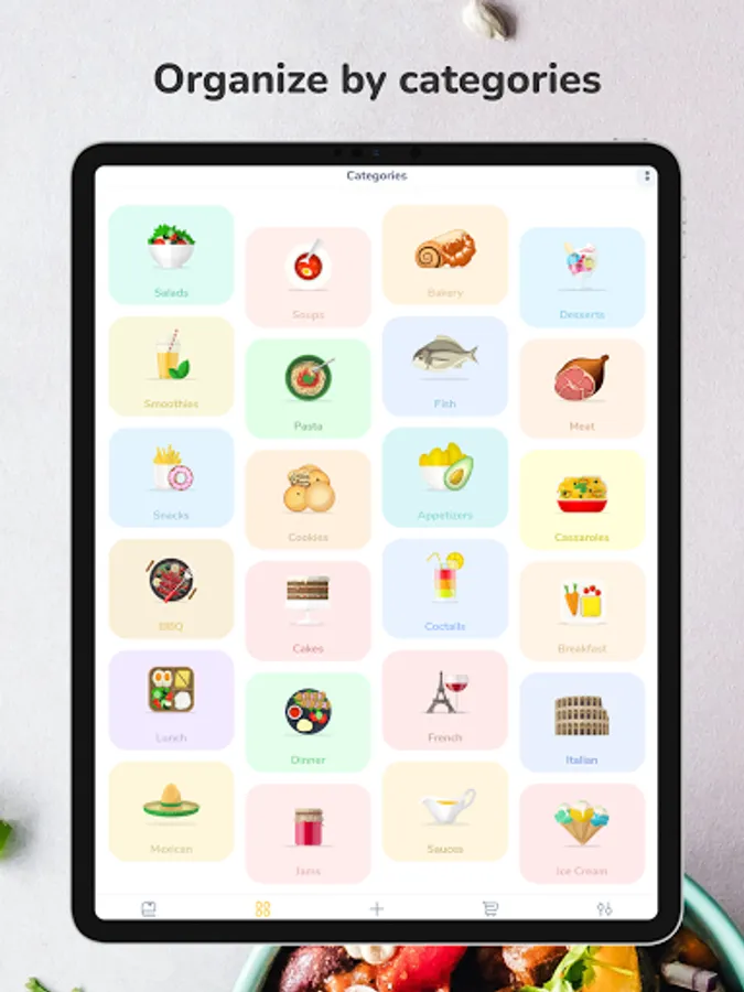 Organize your recipes with categories. Beautiful category icons make the navigation easier. Customize the existing categories or add new ones. Pasta, pizza, BBQ, dinner, desserts - whatever comes up on your mind! Create and organize all the categories that you want, and classify your recipes under those categories.