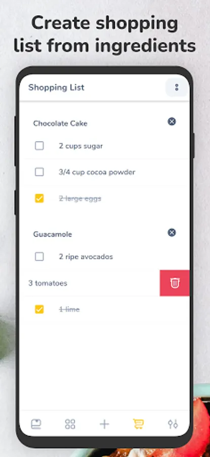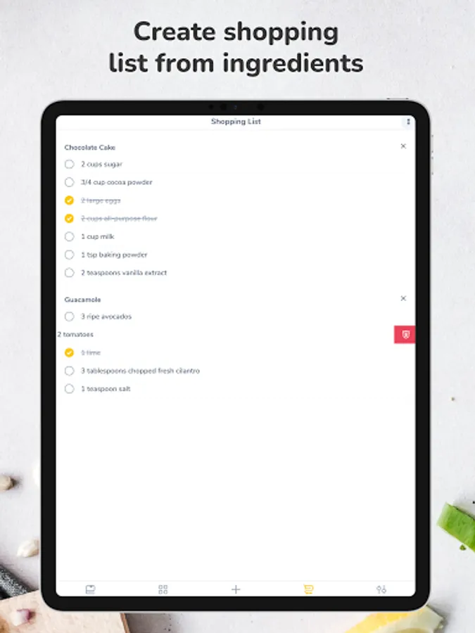 Quickly create a grocery list for all the recipes that you want to cook. Add one or the whole list of ingredients from a recipe straight to the shopping list.
