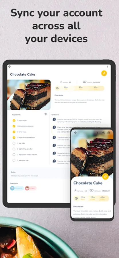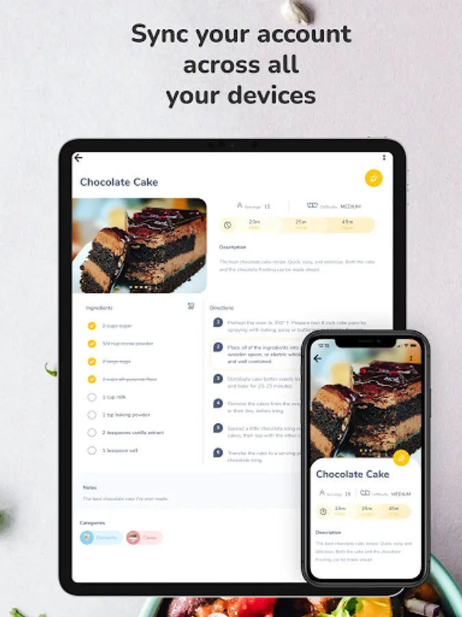 - Sync - Keep your recipes, categories, grocery list and meal plan backed up on our cloud server and synced between all your devices.