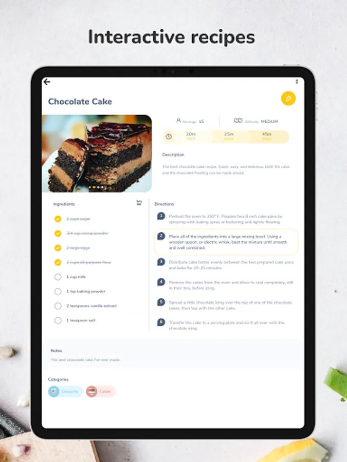 - Interactive Recipes – Keep the screen on while cooking, cross off completed ingredients and highlight your current direction step.