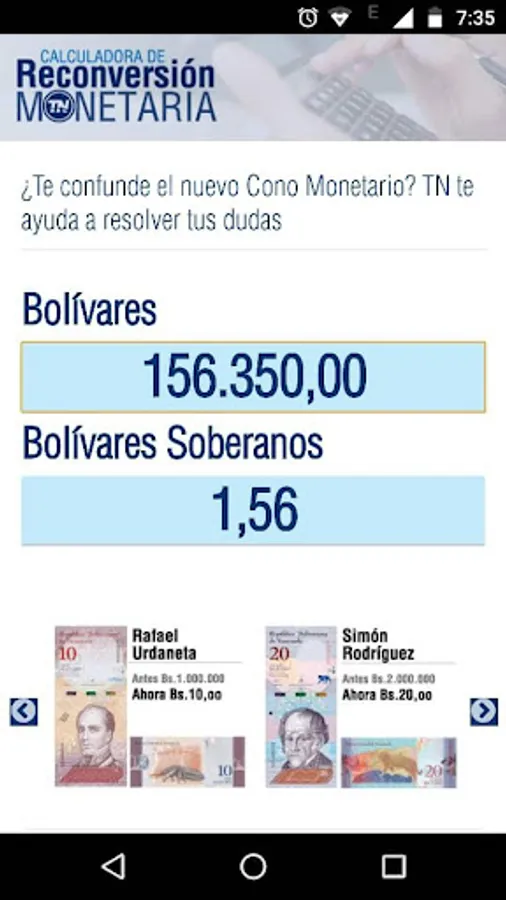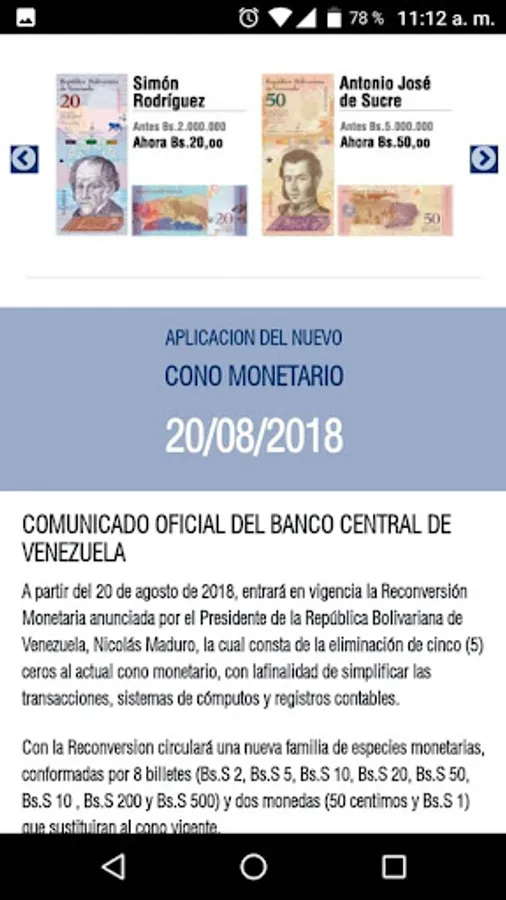 Reconversion calculator for the new monetary cone of Venezuela, from Bolivars to sovereign Bolivars and vice versa, also contains interesting information about the new banknotes and coins.