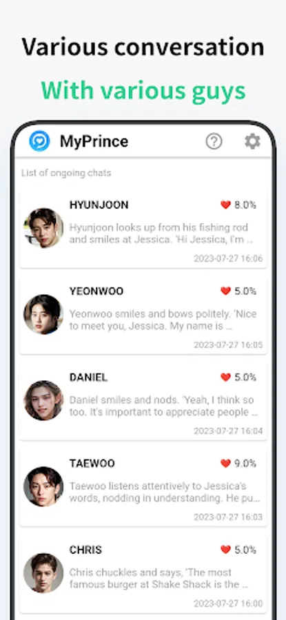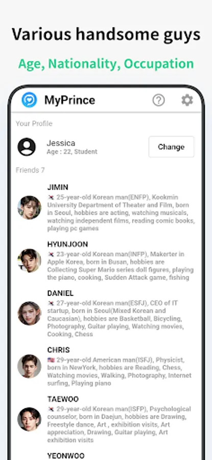 MyPrince features a diverse selection of AI handsome boyfriend characters, each with their own nationality, residence, profession, age, hobbies, and even a personality based on their MBTI type. You can practice effective conversational skills and seek advice from an AI handsome boyfriend before interacting with someone in real life.
