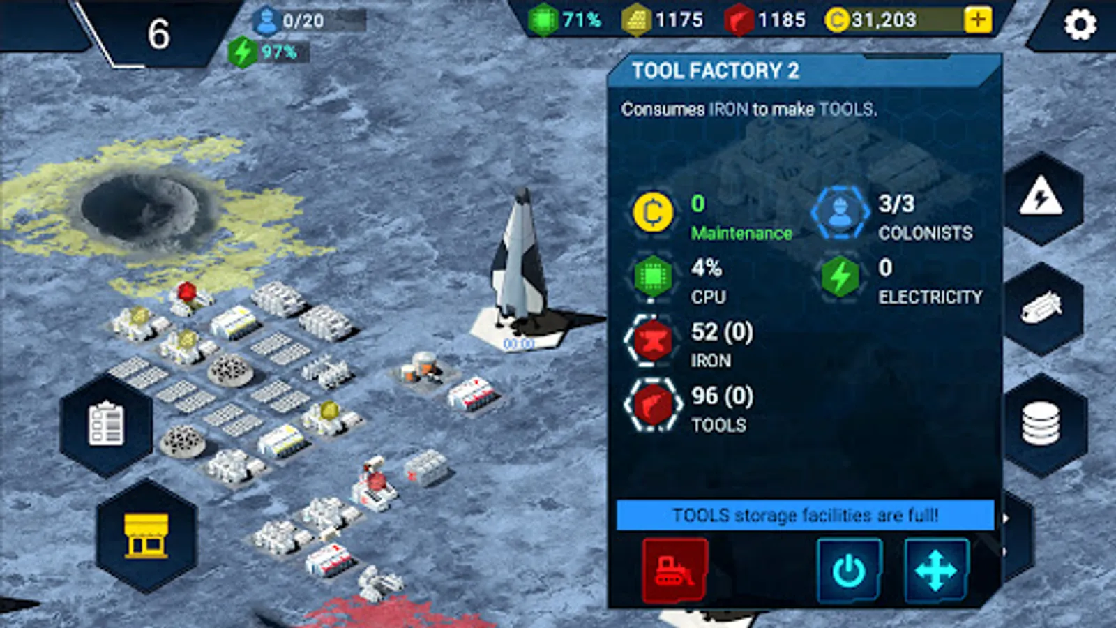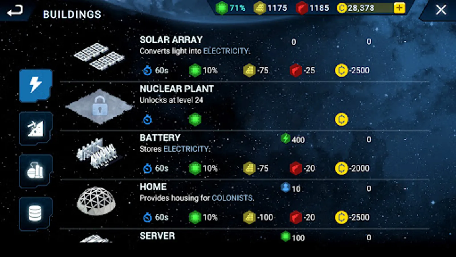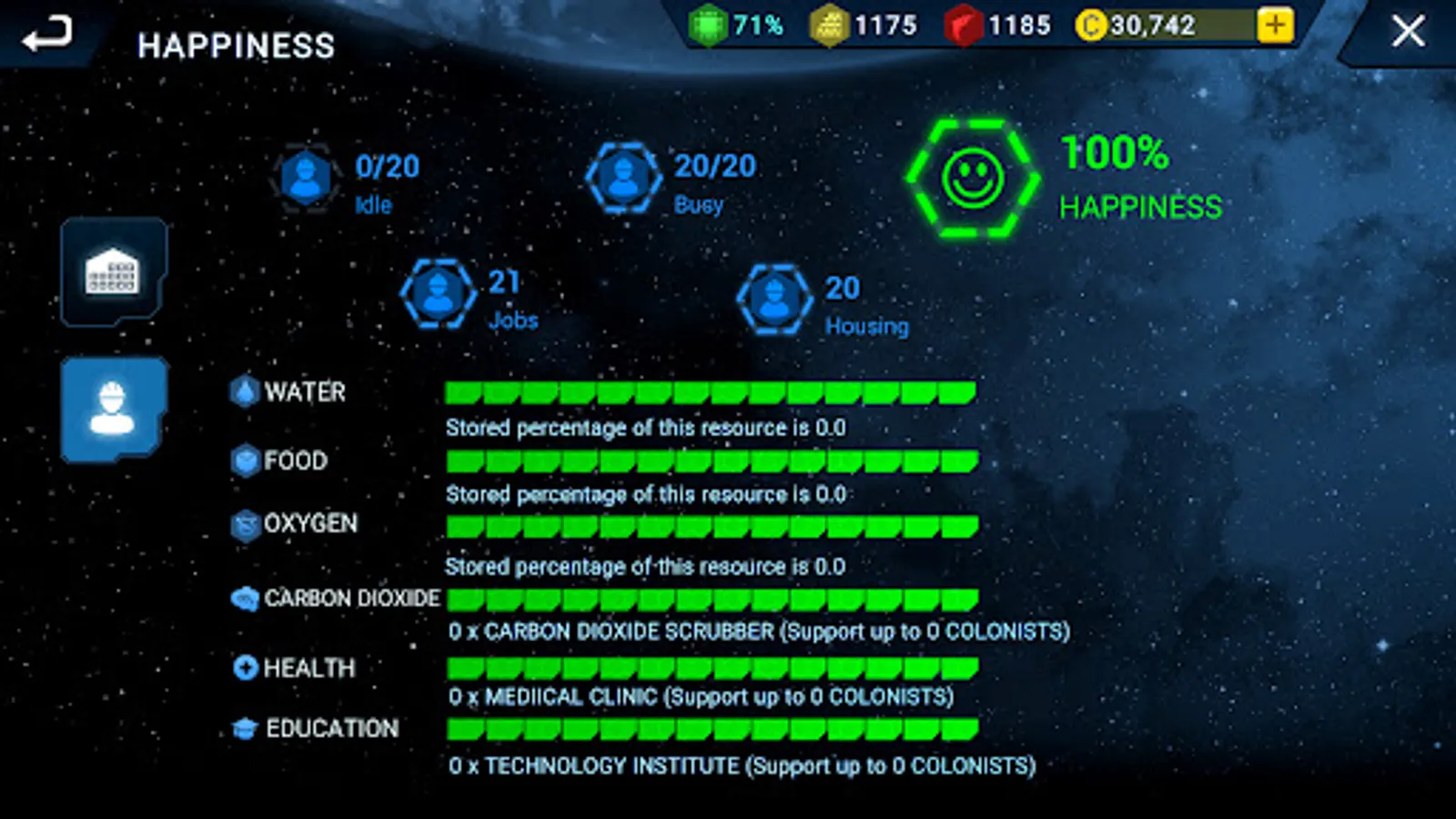 Pantenite Space Colony is constantly growing. Construct infrastructure such as sollar arrays, power plants, batteries, arc reactors, medical clinics, carbon dioxide scrubbers, technology institutions, greenhouses, water extractors, oxygen generators, hydrogen storage facilities, fuel refineries, and so on. Provide your colonists with water, food and oxygen.