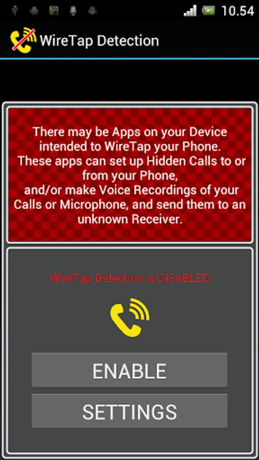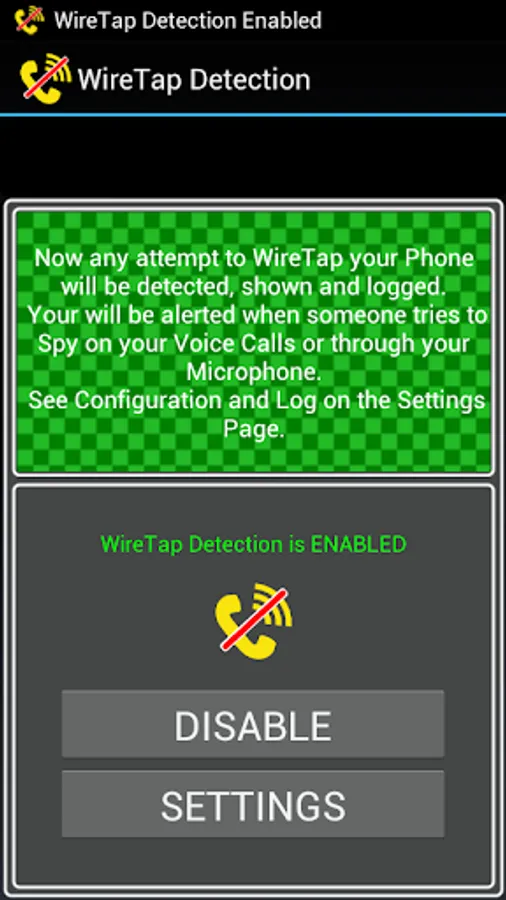 This App - "WireTap Detection" - will protect you from being spied on in these ways, by Detecting all attempts to Tap your Phone. Before you want to make a Recording yourself - or a VoIP (e.g. Skype) Call - simply touch a button to DISABLE the App.
