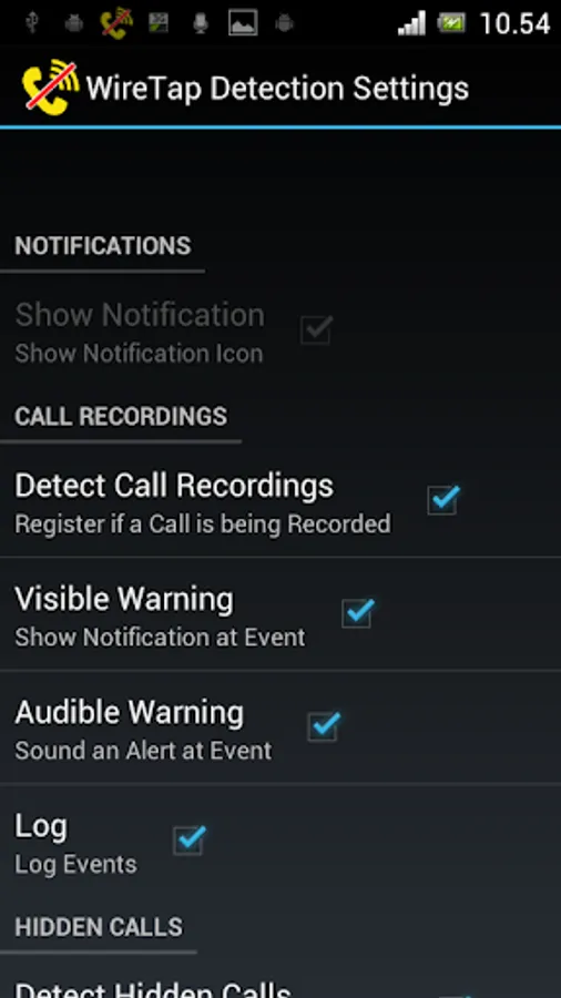 Due to software differences between various Phones, it may be necessary to adjust a Sensibility value to suit your Device. If you should experience MANY Normal Calls as being registered as Hidden, you should LOWER the Sensibility Factor (found on the Settings Page).