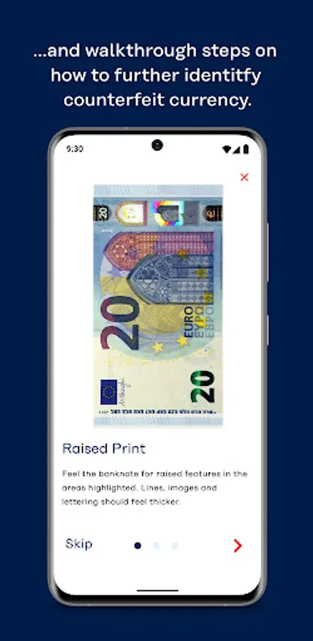 • Walk-through steps guide you through further identification techniques to help identify counterfeit currency.