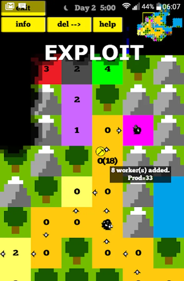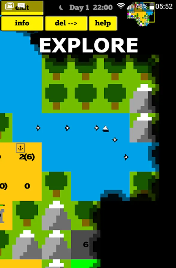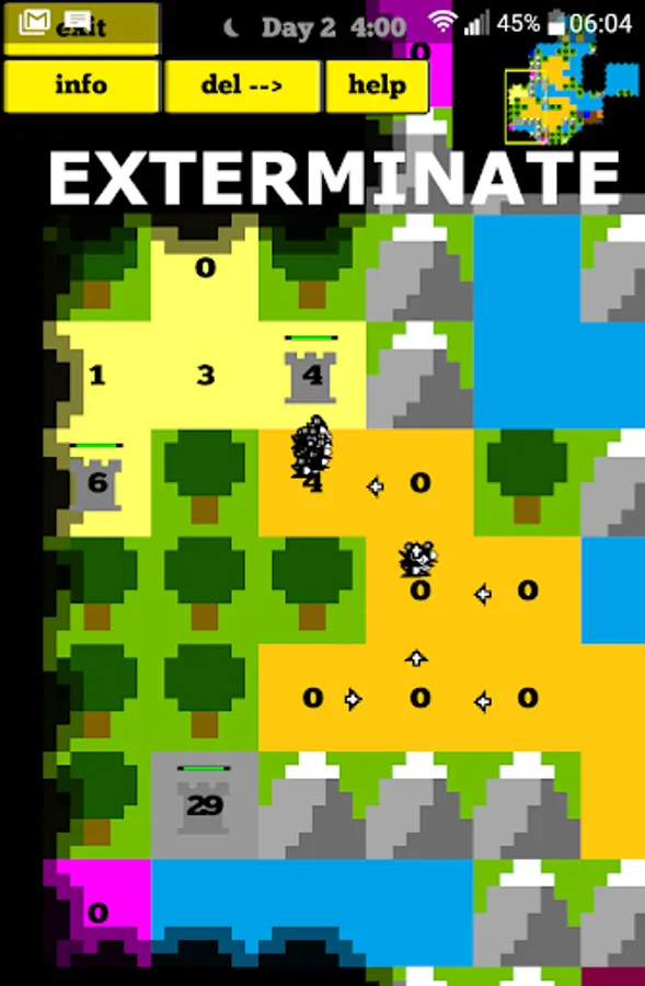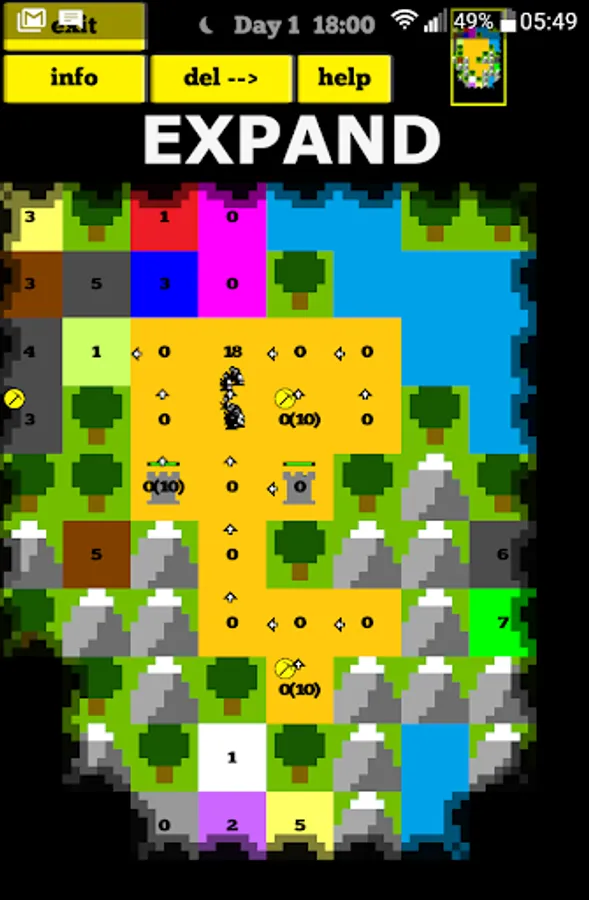 You start with a single yellow square with 50 soldiers. The map is almost entirely blacked out by the fog of war. Begin by expanding your territory, increasing your view. Build castles, train more soldiers and expand further.