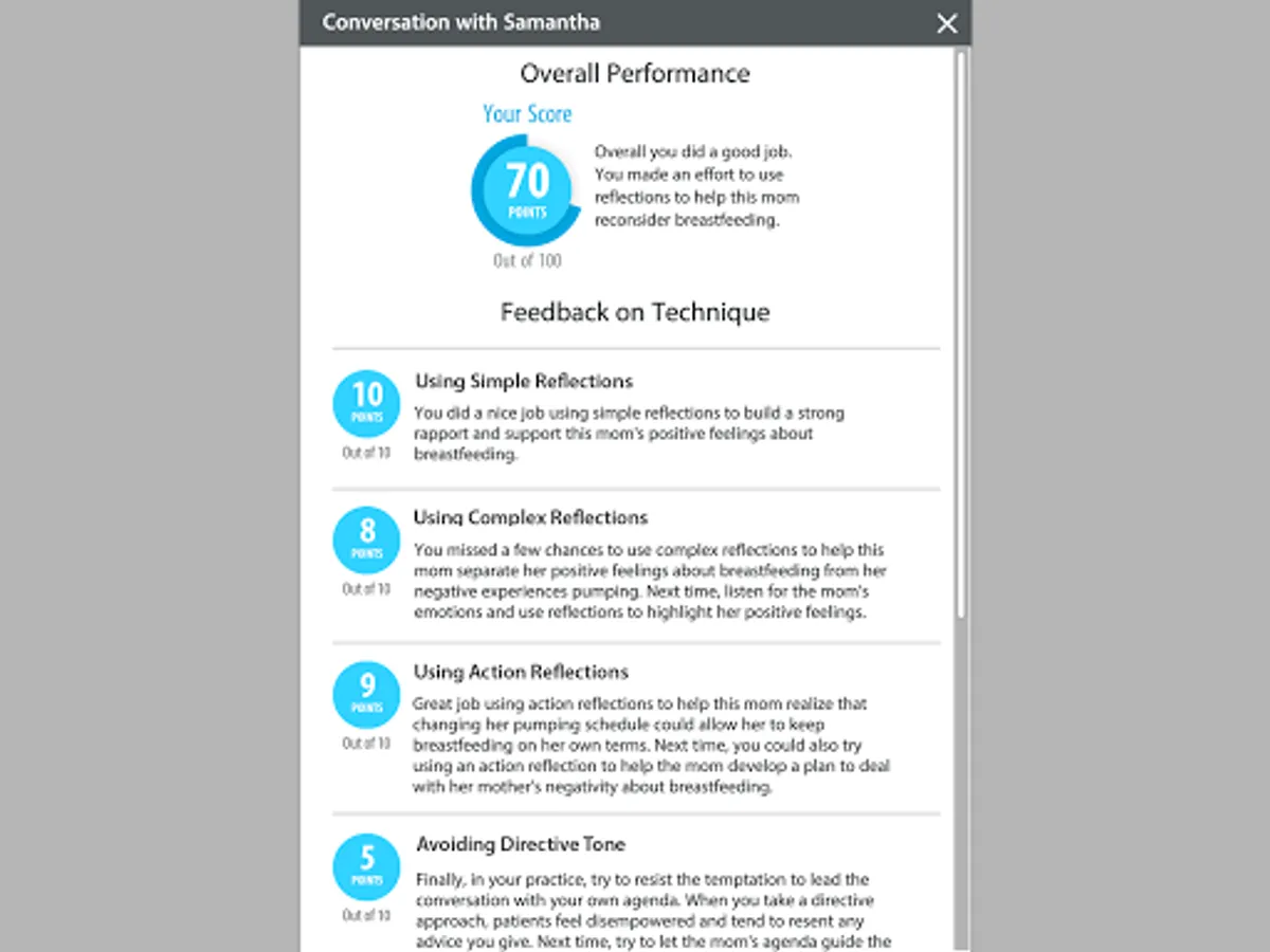 - Learn by engaging in a series of simulated role-play conversations with fully animated parents and their children, while receiving personalized feedback from a virtual coach