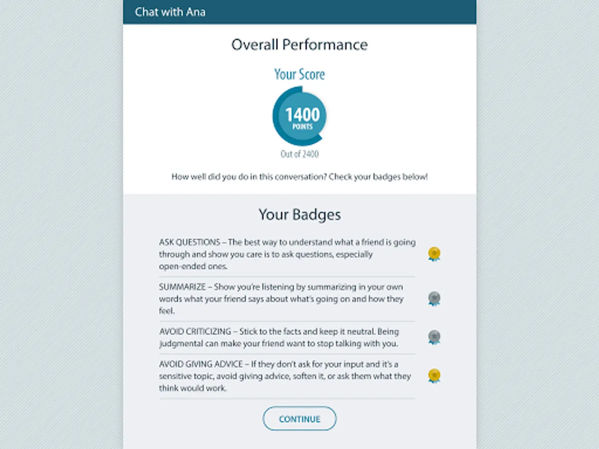 In Friend2Friend, you’ll meet Michael and Ana, teens who have both struggled with stressful situations in their lives. You’ll learn about how overall health includes both your mind and your body. Then you’ll take on the role of Michael and navigate an interactive role-play conversation with “virtual” Ana to help her open up and strategize how to help her connect to a trusted adult. Listening is important, and so is knowing that it’s ok to ask about suicide.