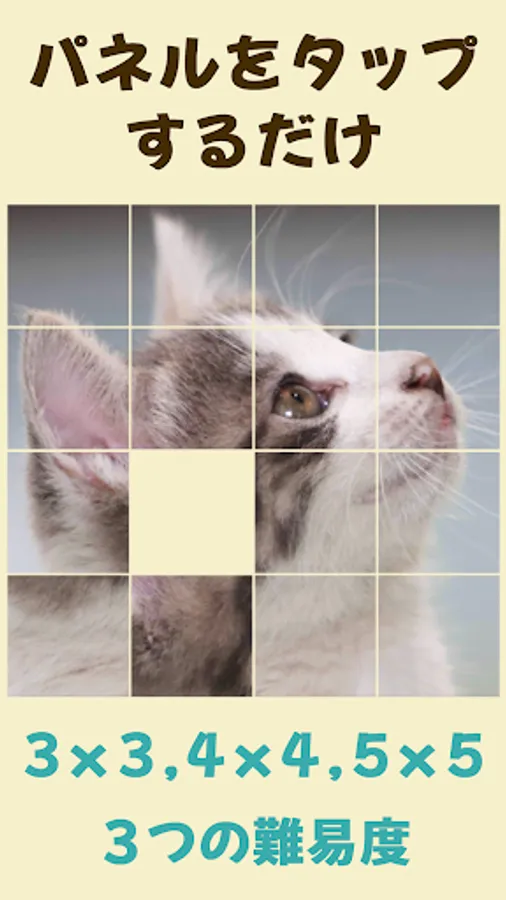 ・You can choose from 3 difficulty levels: 3x3 (8 puzzles), 4x4 (15 puzzles), and 5x5 (24 puzzles).