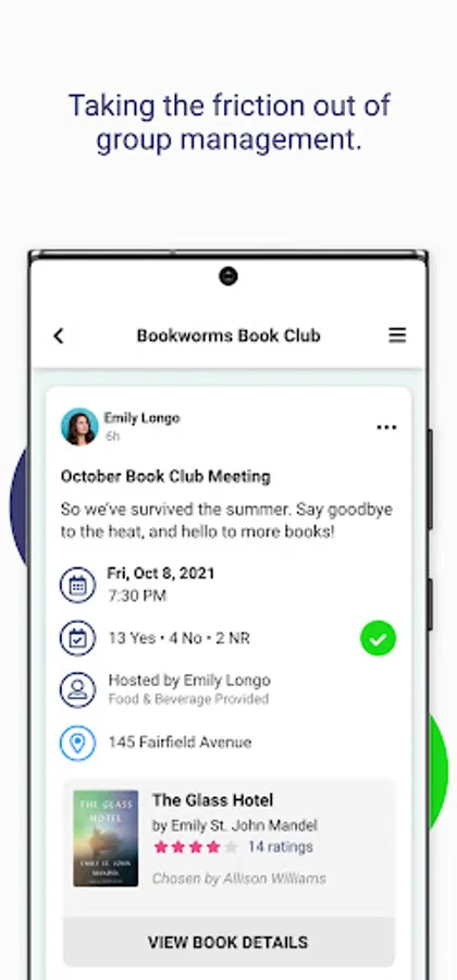 Unlike other book club apps looking to sell you books or collect your data, GroupSpot’s only interest is your Book Club. We make your monthly meetings great by sharing important details like discussion topics, RSVP, and host messages. We’ve also created a home for your past books where you can access, rate, and review any book ever read by your Book Club.