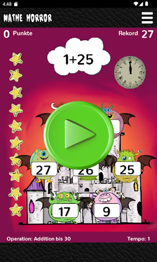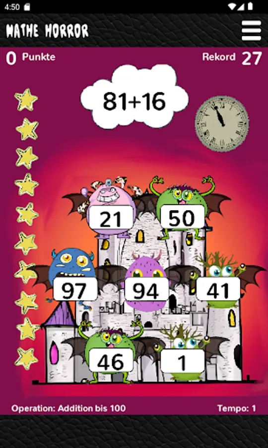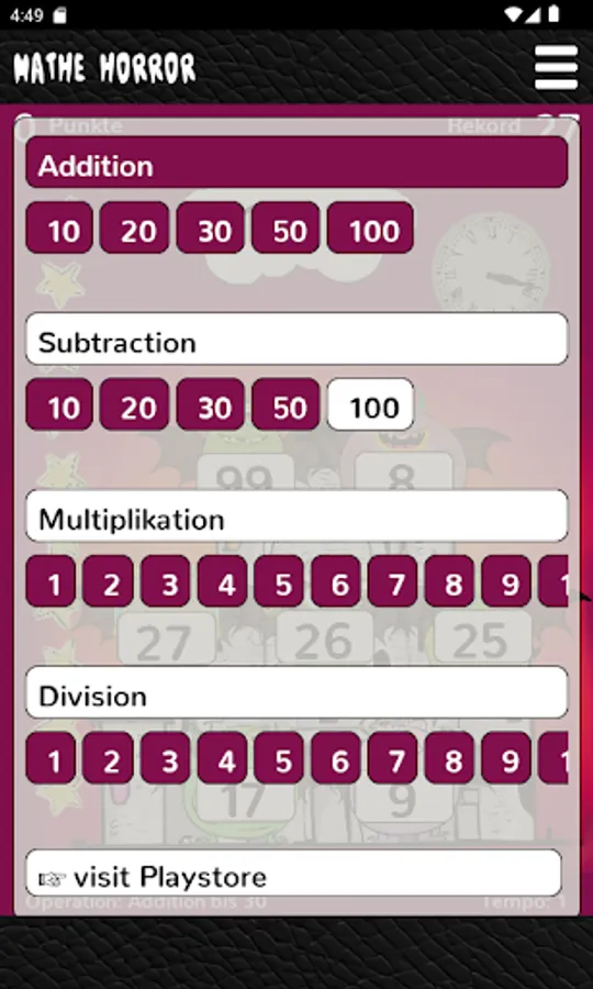 It can be set exactly which types of calculation are to be practiced in which number range. Only a certain amount of time is available to solve the tasks. The more task types are mastered, the higher the achievable high score.