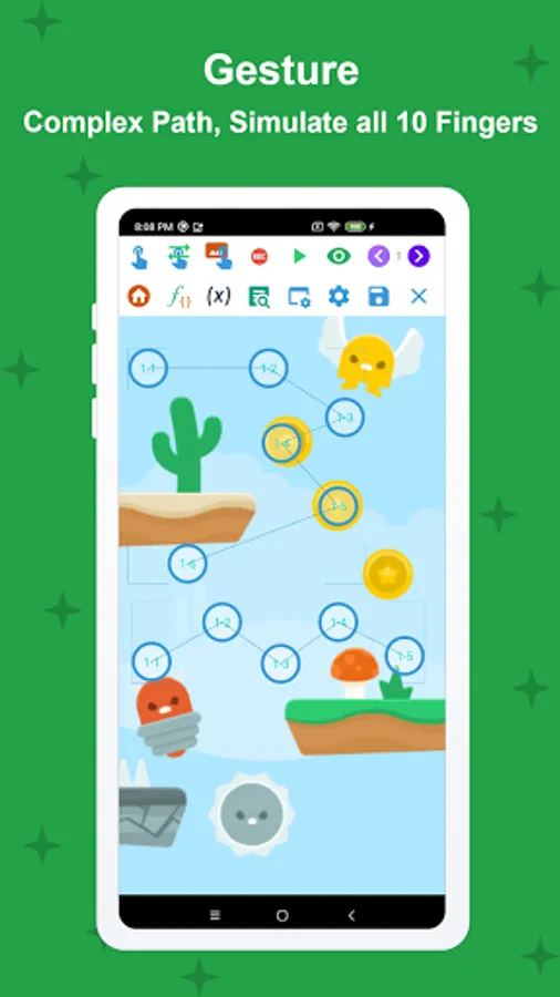 • Record and Replay: Record your touches and replay them. This recording can be edited freely, mixed and matched in any order, played at different speeds and intervals. You can even randomize every touch point in it.