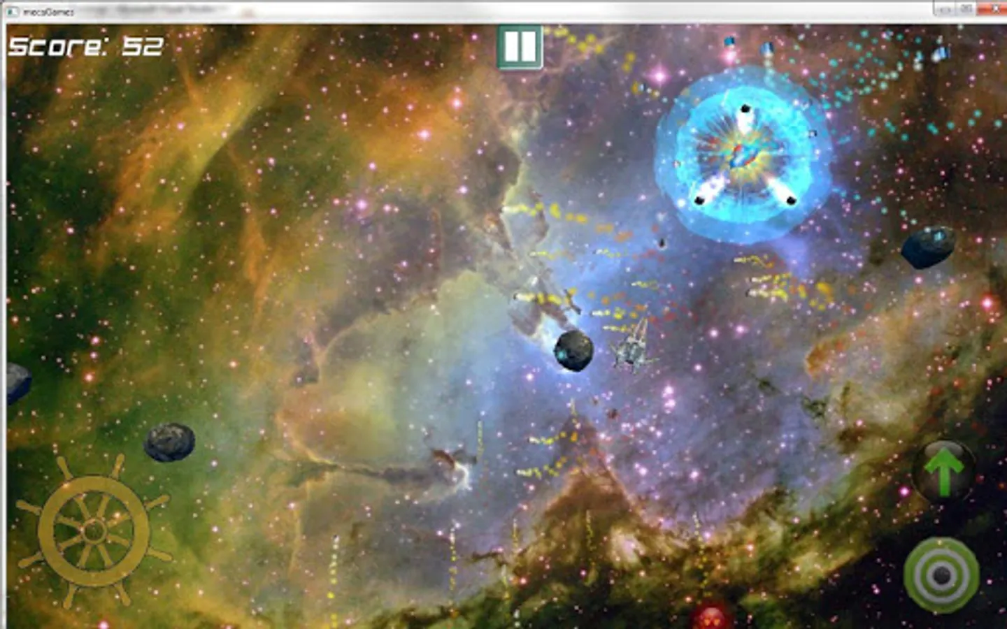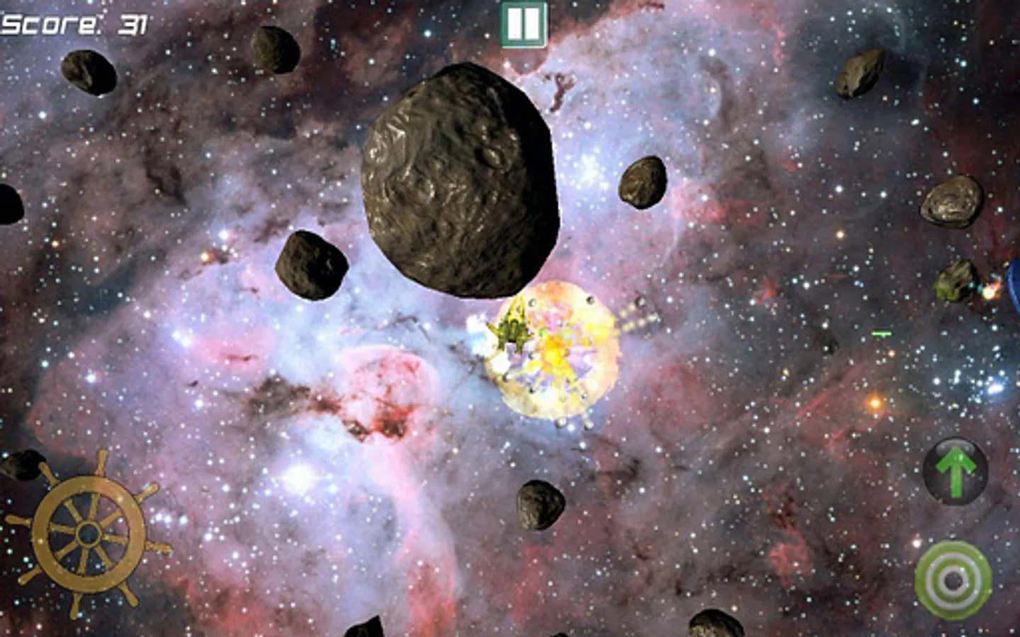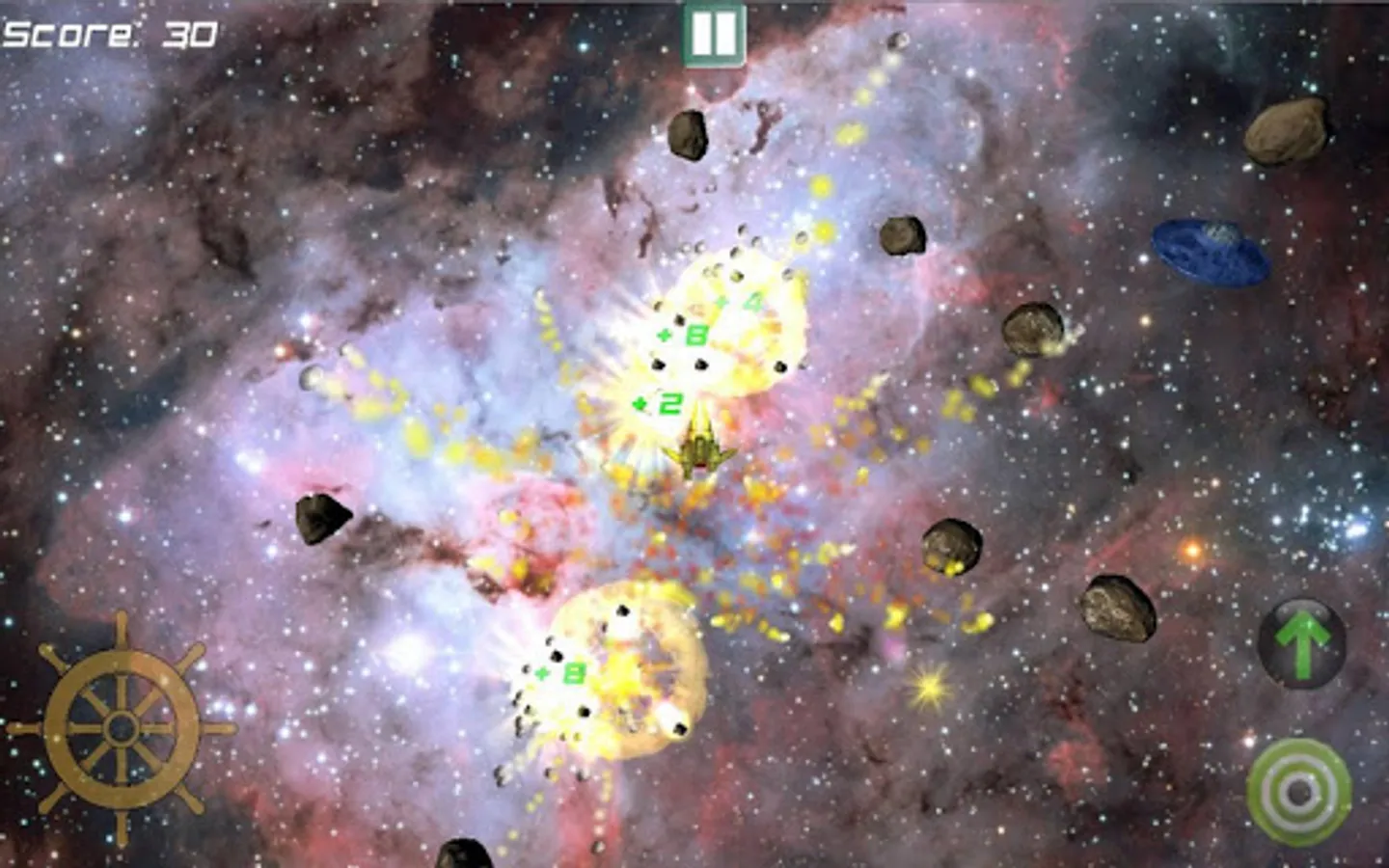 There is also a "Classic" game mode: Play a classic Asteroids-style game. You have no shield but an Hyperspace button to escape difficult situations (but where you will respawn, it could be worst). Each asteroid you hit will be divided into 2 smaller asteroids. The smaller it is, the more points you will be awarded.