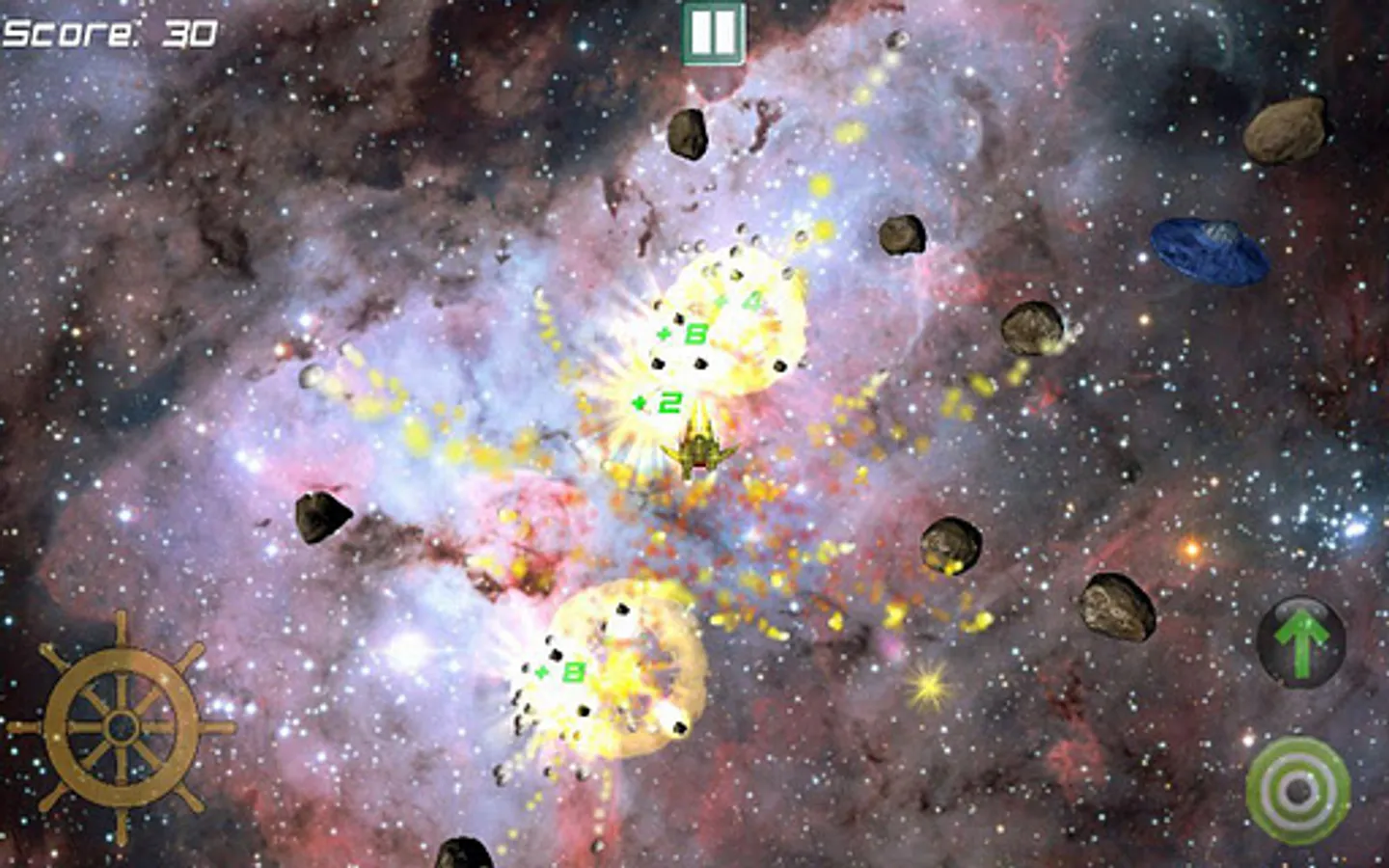 Asteroids and UFO destroyed by ionised systems will generate 3 deadly ionised fragments which can destroy other objects in a chain reaction pattern. The deeper the object is in the chain level, the more points it will give you.