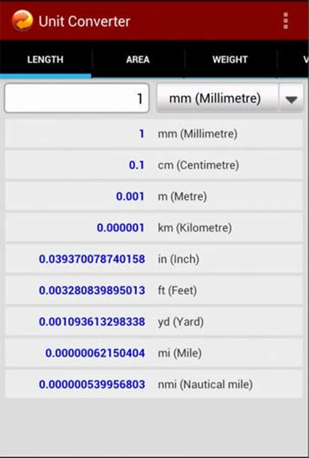 1) Length - mm (Millimetre), cm (Centimetre), m (Metre), km (Kilometre), in (Inch), ft (Feet), yd (Yard), mi (Mile), nmi (Nautical mile).