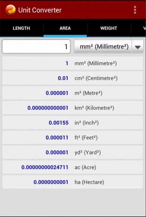 2) Area - mm² (Millimetre²), cm² (Centimetre²), m² (Metre²), km² (Kilometre²), in² (Inch²), ft² (Feet²), yd² (Yard²), ac (Acre), ha (Hectare).