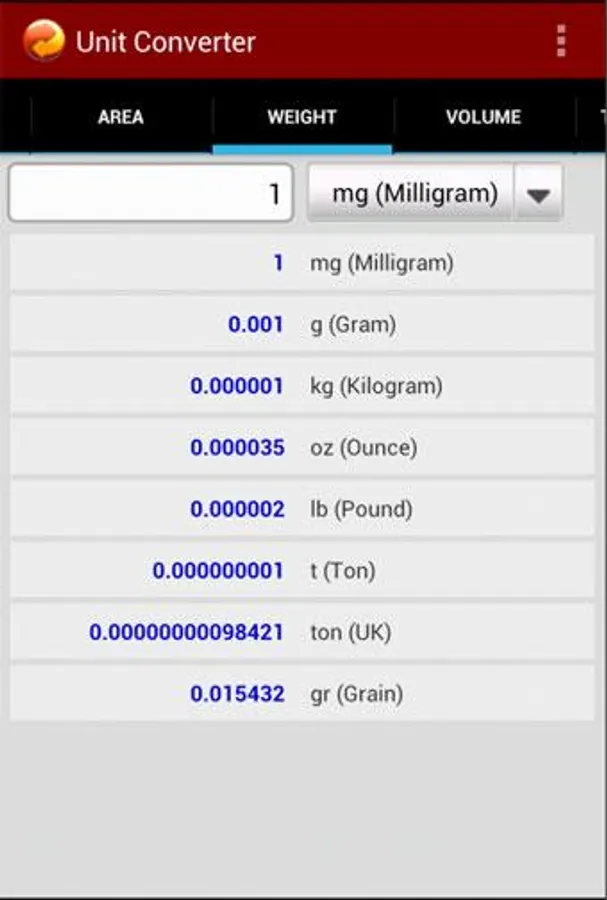3) Weight - mg (Milligram), g (Gram), kg (Kilogram), oz (Ounce), lb (Pound), t (Ton), ton (UK), gr (Grain).