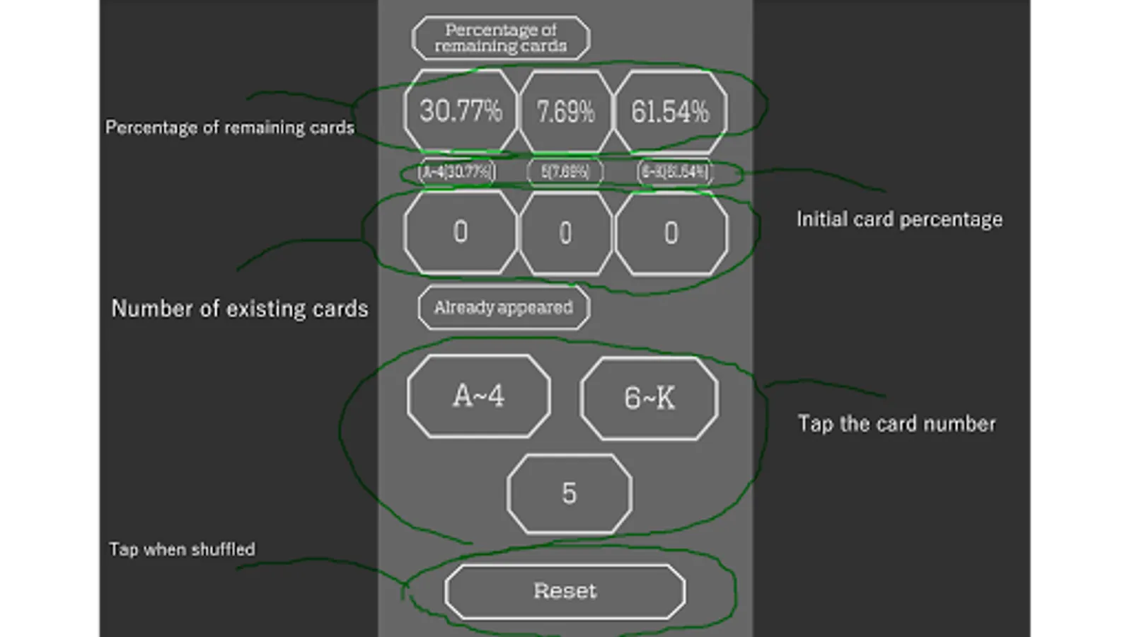 With this simple and stylish app, you can easily grasp percentage of remaining cards in Baccarat just by tapping the smartphone!