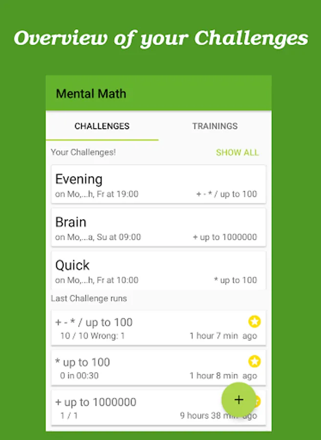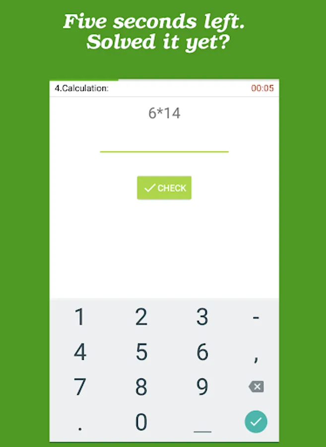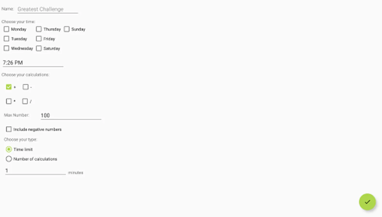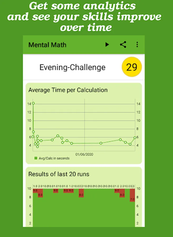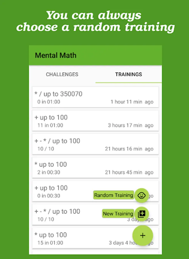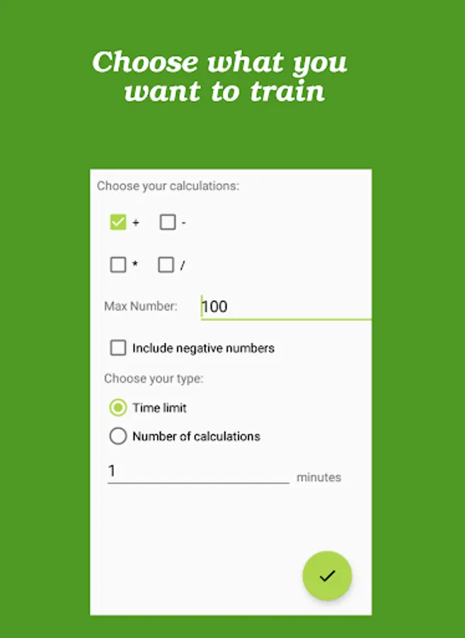 You can choose from any of the four basic arithmetical operations(+,-,*,/). Mix them together or train just one of them. To get things more interesting you can choose a time limit. Choose one minute for your training and do as many calculations as you can. If you like it more relaxed you can just do a fixed number of calculations per training.