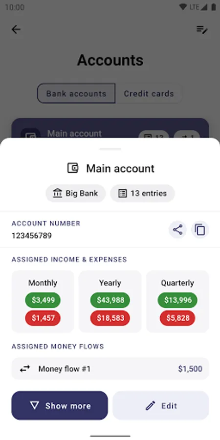 Represent your accounts and their assigned income and expenses as well as money flows. For quick access, you can also store data such as your account numbers.