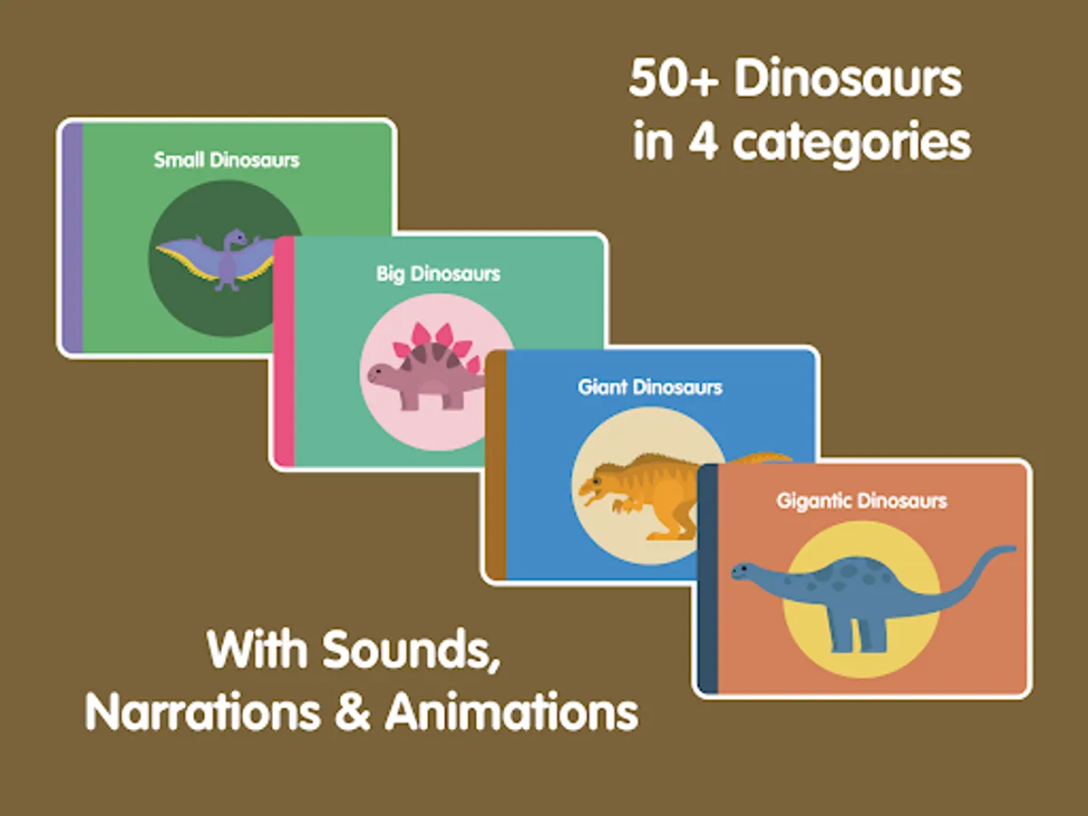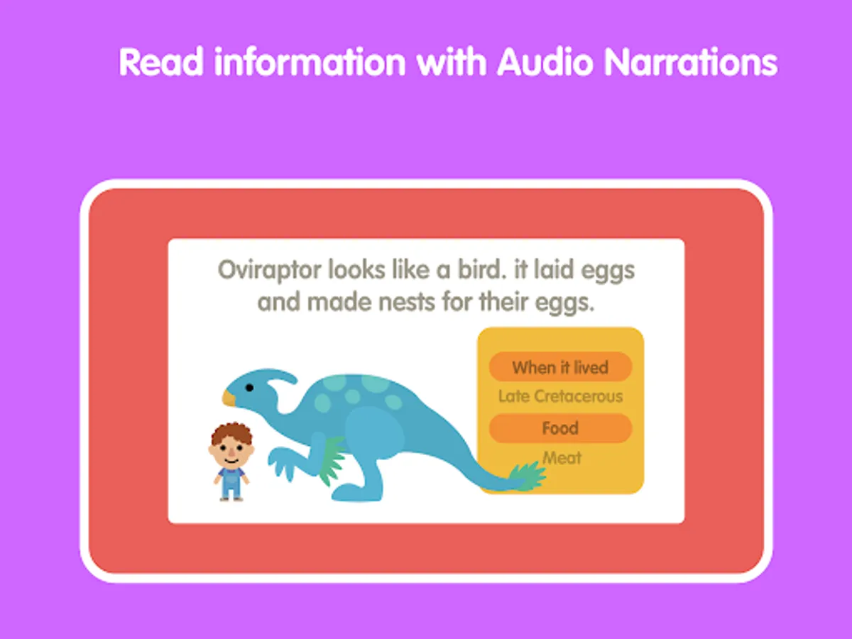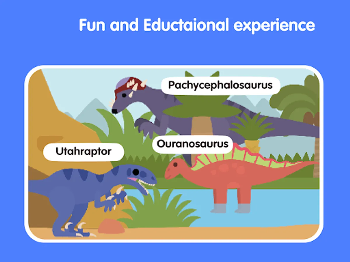 Prepare to enter the world of dino learning where fun and interactive learning await you! Growing kids and toddlers can make the most of their learning experience with this dinosaur themed app to play and learn about animals. Improve kids memory and get dino learning without any boredom. Featuring a myriad of impressive dinosaur names with pictures and their habitat scenery animations, this app is enriched with cool dinosaur games and tons of valuable information on dinosaurs.