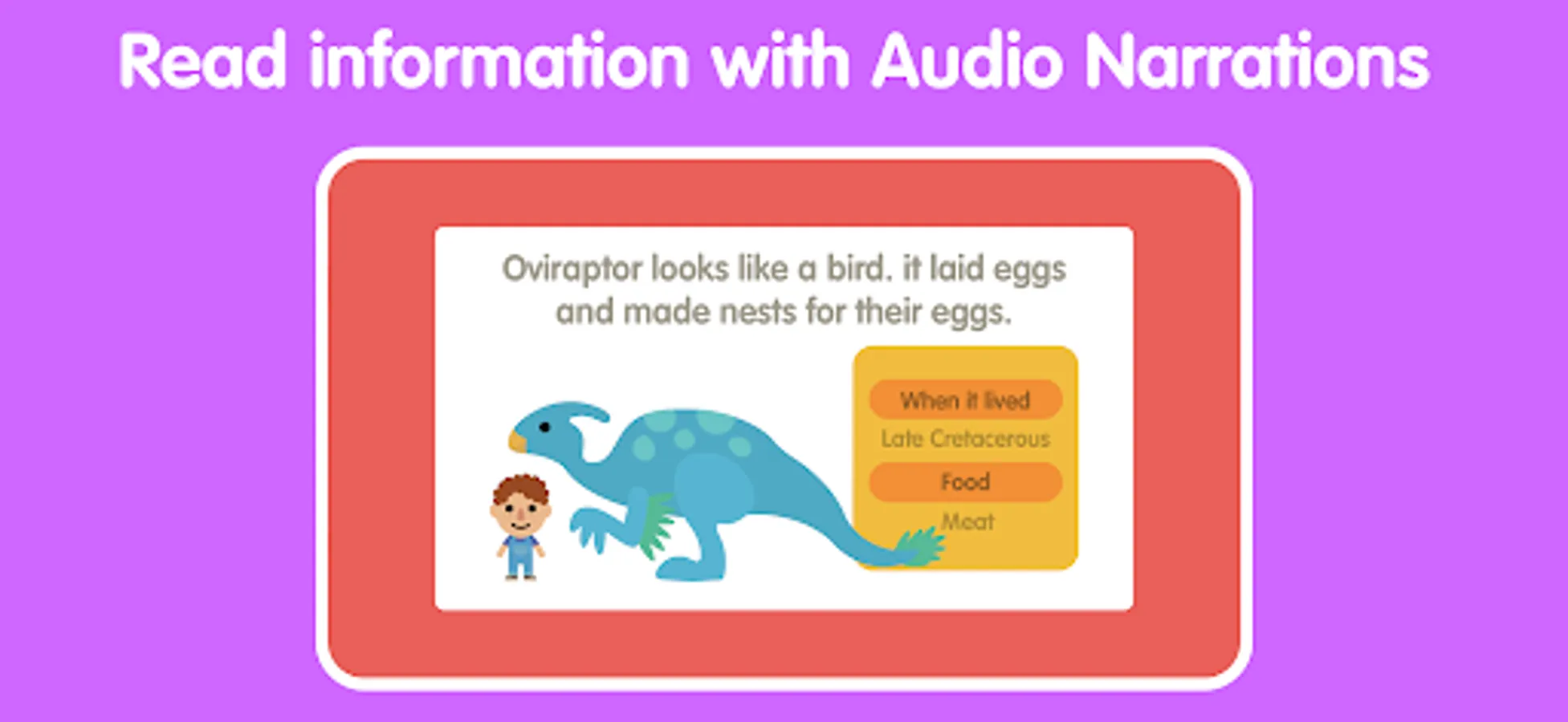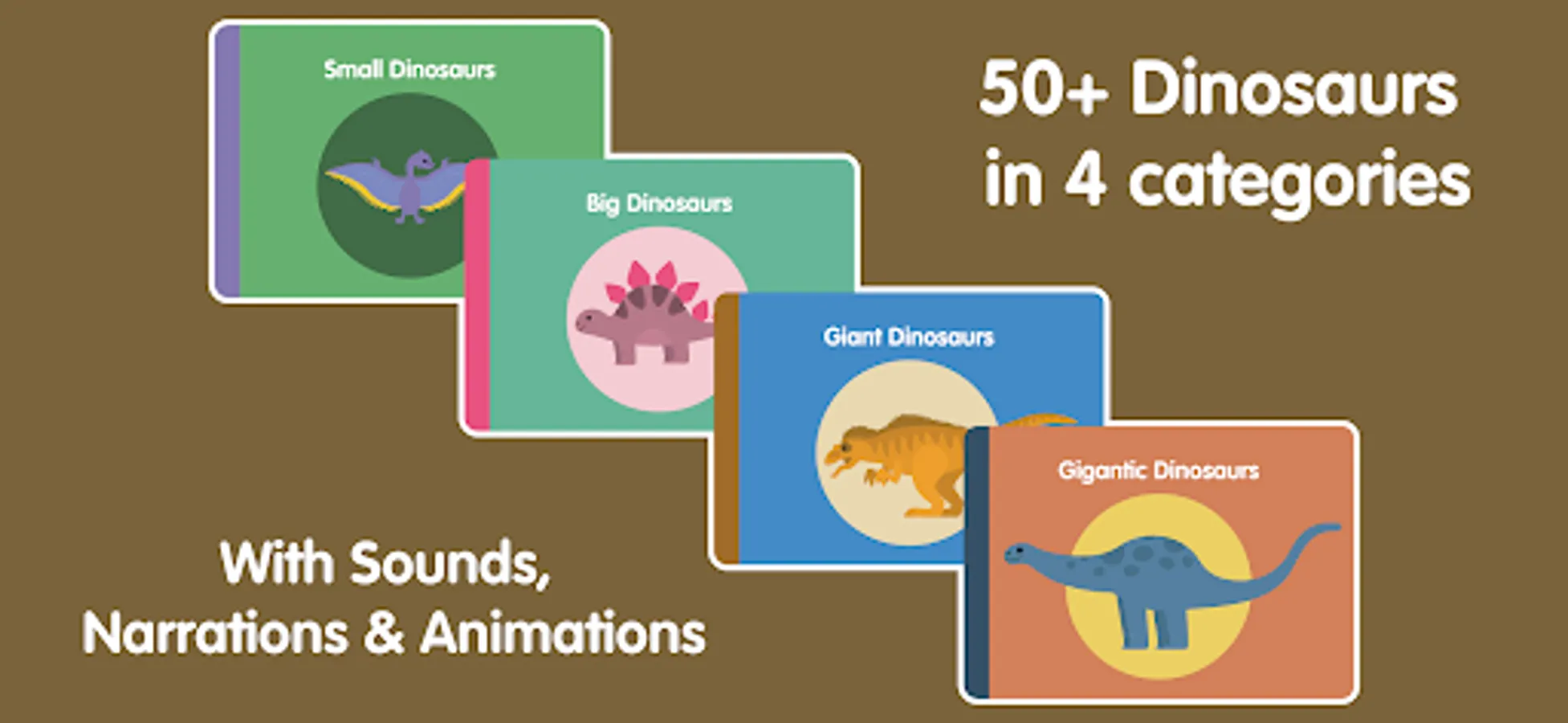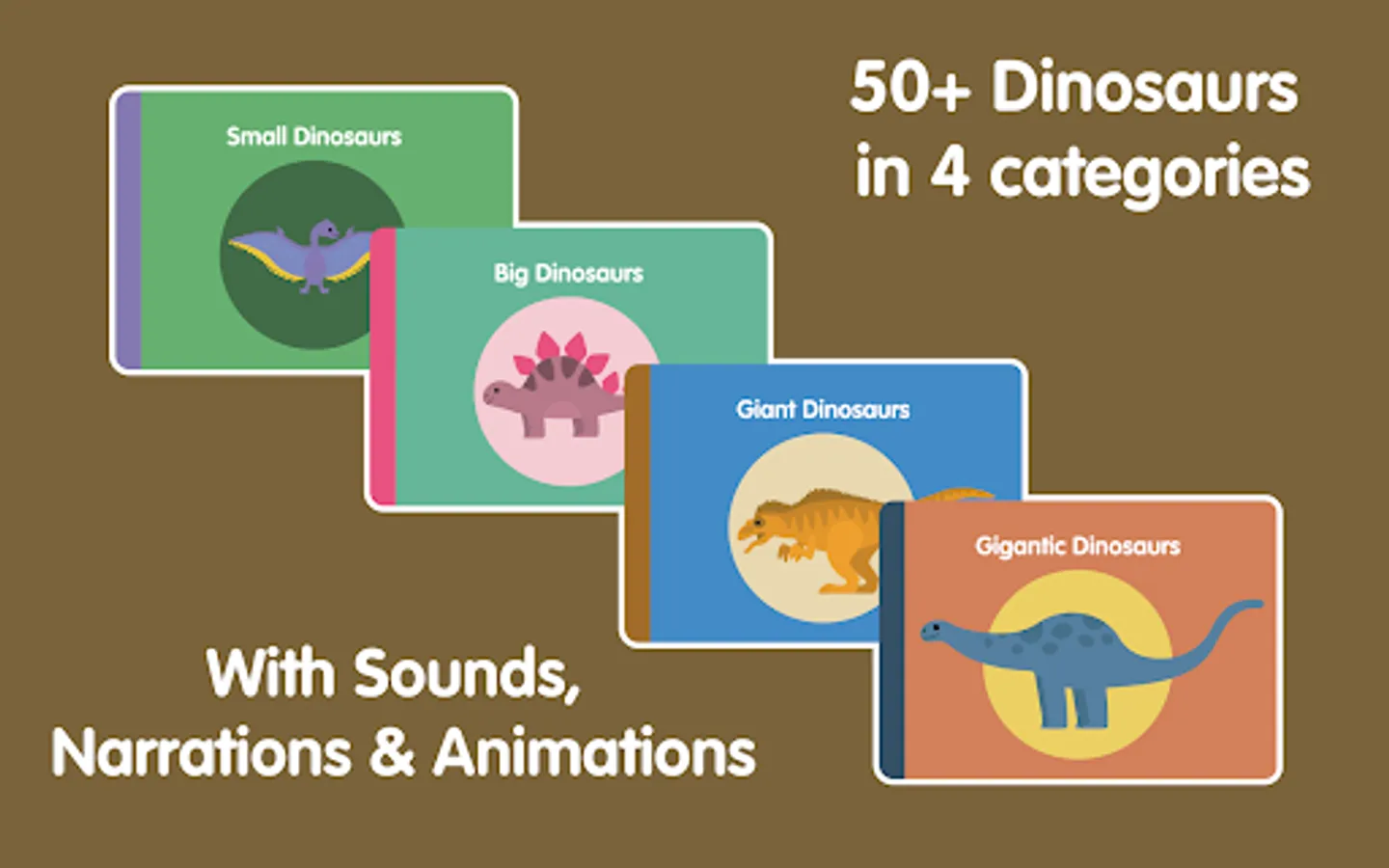 Prepare to enter the world of dino learning where fun and interactive learning await you! Growing kids and toddlers can make the most of their learning experience with this dinosaur themed app to play and learn about animals. Improve kids memory and get dino learning without any boredom. Featuring a myriad of impressive dinosaur names with pictures and their habitat scenery animations, this app is enriched with cool dinosaur games and tons of valuable information on dinosaurs.
