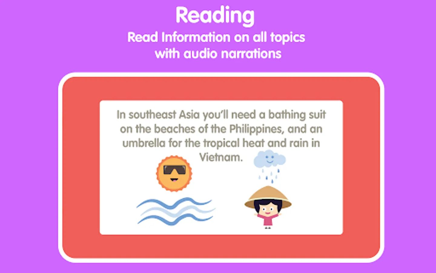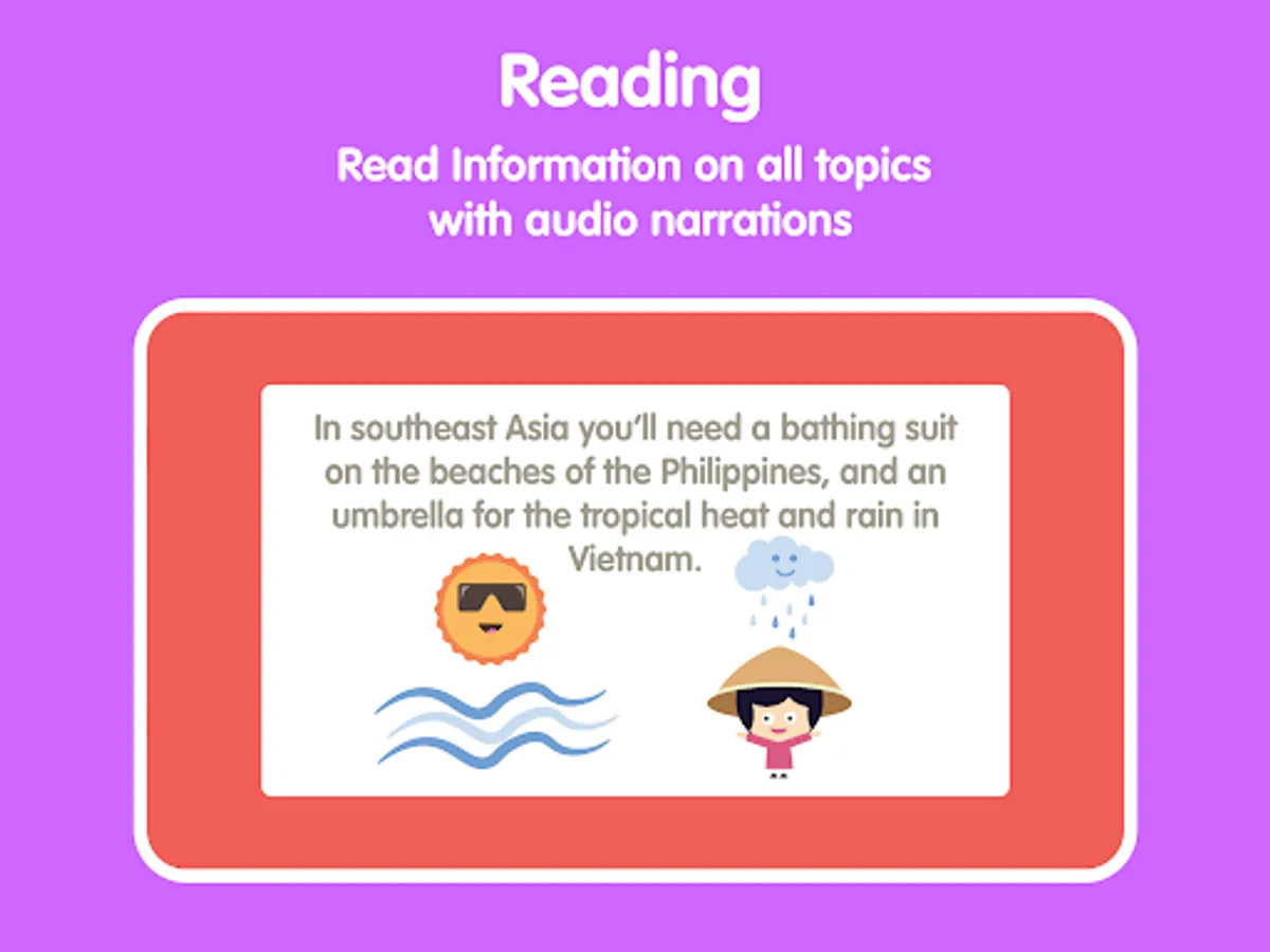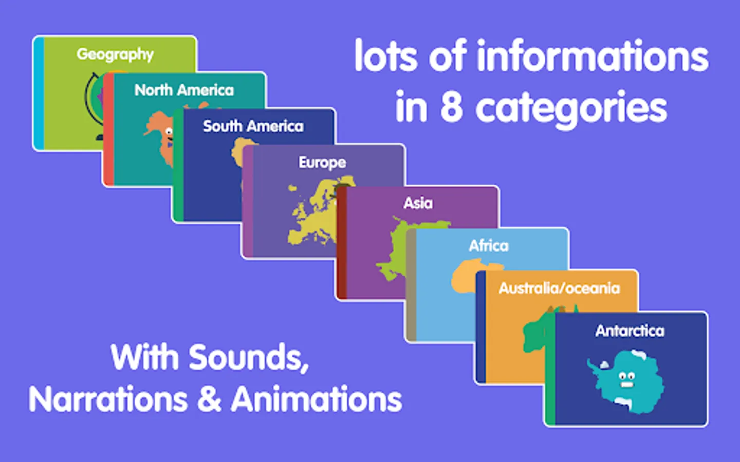 We have carefully included sounds and animations with amazing art to make learning geography an easy and enjoyable experience for children of all ages. This app will give your child an opportunity to increase their knowledge about the world around us and learn many fun facts about continents, countries, flags and many more.
