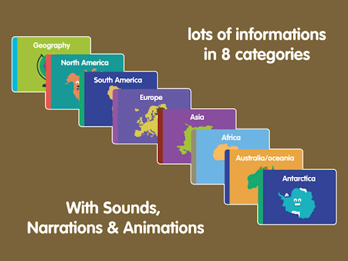 Are you ready to introduce your child to geography? Look no further! this futuristic world geography learning app for kids is made to offer your child a fun and easy way to learn about continents, countries, flags, fun facts, books, and images never like before.