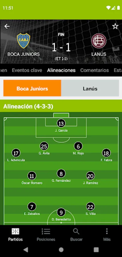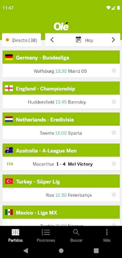 Results Olé gives you detailed information of the matches in real time and a super special plus: even live animated graphics on the actions of the matches. And the complete information of each game: team formations, substitutes, sides, corners, yellow cards, changes and other statistical information.