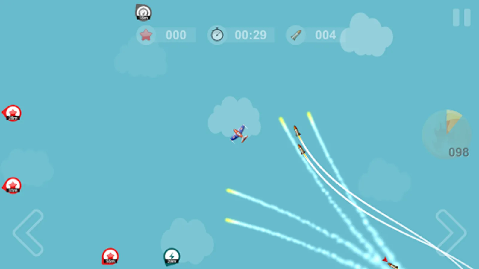 Use the simple control to fly your plane and avoid the missiles. Make them collide with each other and collect stars to increase final score.
