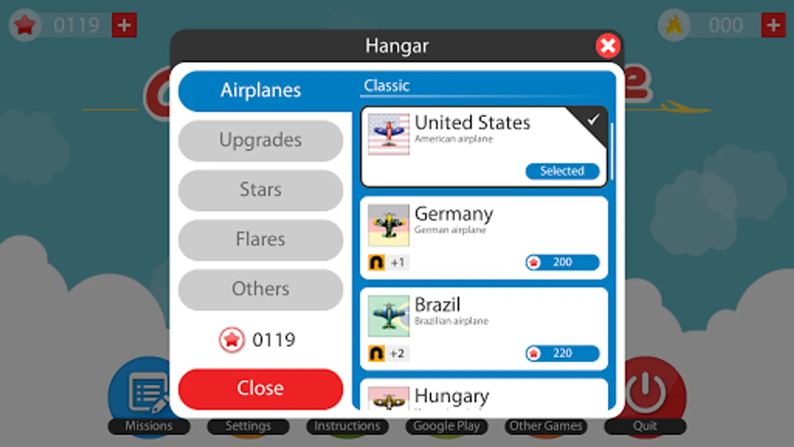 - Collect stars to increase the final score and unlock new planes and upgrades;
