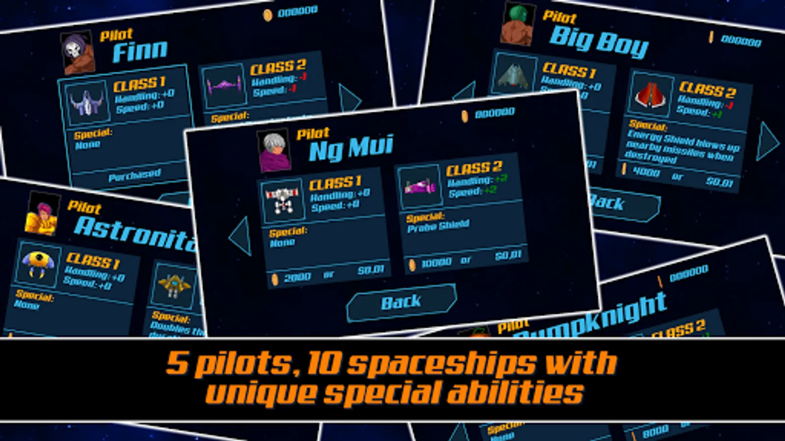 Missile Escape: Space features 10 spaceships from 5 pilots. You can pilot ordinary Class 1 spaceships or the most powerfull Class 2 ones, each one with a unique special ability.