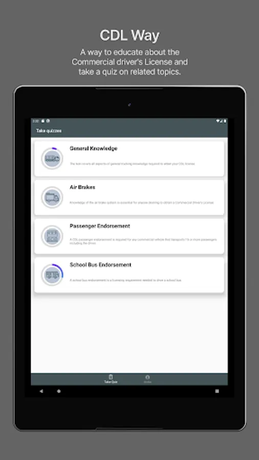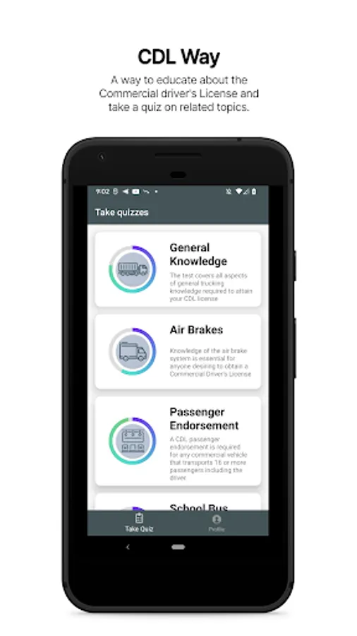 CDL Way provides a way to educate about the Commercial driver's License and take a quiz on related topics.